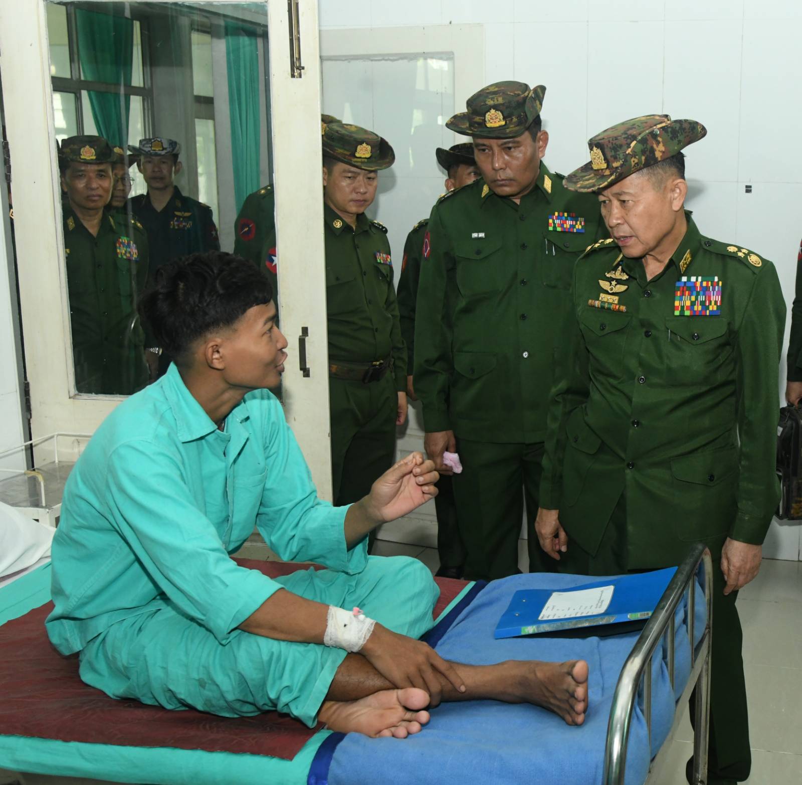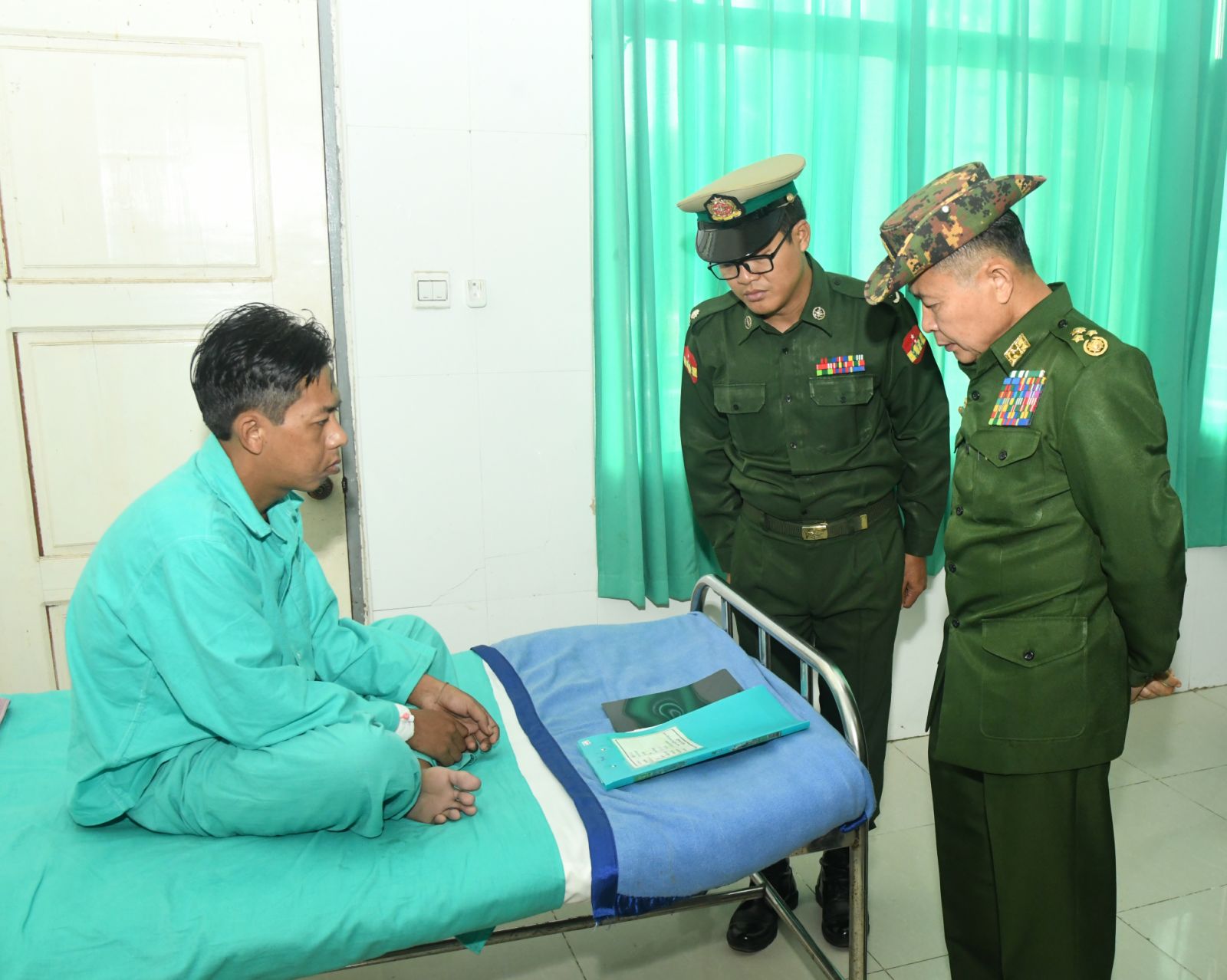 ထို့နောက် နိုင်ငံတော်စီမံအုပ်ချုပ်ရေးကောင်စီဒုတိယဥက္ကဋ္ဌ ဒုတိယတပ်မတော်ကာကွယ်ရေးဦးစီးချုပ်၊ ကာကွယ်ရေးဦးစီးချုပ်(ကြည်း)နှင့် အဖွဲ့ဝင်များသည် မုံရွာမြို့ရှိ နယ်မြေခံတပ်မတော်ဆေးရုံတွင် တက်ရောက်ဆေးကုသမှု ခံယူလျက်ရှိသည့် နိုင်ငံတော်ကာကွယ်ရေးနှင့် လုံခြုံရေးတာဝန်များထမ်းဆောင်စဉ် ထိခိုက်ဒဏ်ရာရရှိခဲ့သော အရာရှိ၊ စစ်သည်များ၊ မြန်မာနိုင်ငံရဲတပ်ဖွဲ့ဝင်များ၊ ပြည်သူစစ်(ဌာနေ)တပ်ဖွဲ့ဝင်များအား တစ်ဦးချင်းလိုက်လံတွေ့ဆုံ၍ ထိခိုက်ဒဏ်ရာရရှိခဲ့မှု အခြေအနေများ၊ ဆေးဝါးကုသမှုပေးထားသည့် အခြေအနေများ၊ ရောဂါကုသပျောက်ကင်းသက်သာမှု အခြေအနေများနှင့် ကျန်းမာရေးတိုးတက်ကောင်းမွန်မှုအခြေအနေများကို ရင်းရင်းနှီးနှီးမေးမြန်းကာ အားပေးစကားပြောကြားပြီး တင်ပြချက်များအပေါ် လိုအပ်သည်များ ပေါင်းစပ်ညှိနှိုင်းဖြည့်ဆည်းဆောင်ရွက်ပေးကာ ထောက်ပံ့ပစ္စည်းများနှင့် ဂုဏ်ပြုချီးမြှင့်ငွေများ ပေးအပ်သည်။