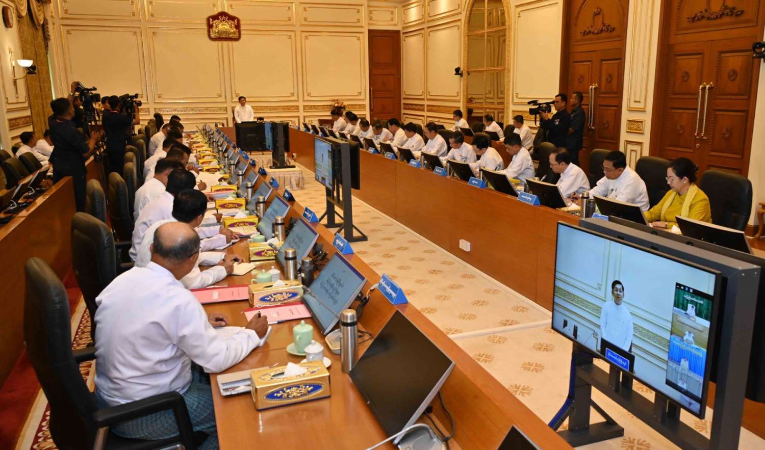 အစည်းအဝေးသို့ ပြည်ထောင်စုဝန်ကြီးများနှင့် တာဝန်ရှိသူများ တက်ရောက်ကြပြီး နေပြည်တော်ကောင်စီဥက္ကဋ္ဌ၊ တိုင်းဒေသကြီးနှင့် ပြည်နယ်ဝန်ကြီးချုပ်များက Video Conferencing ဖြင့်တက်ရောက်ကြသည်။
