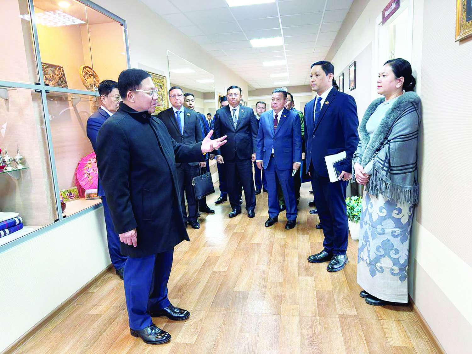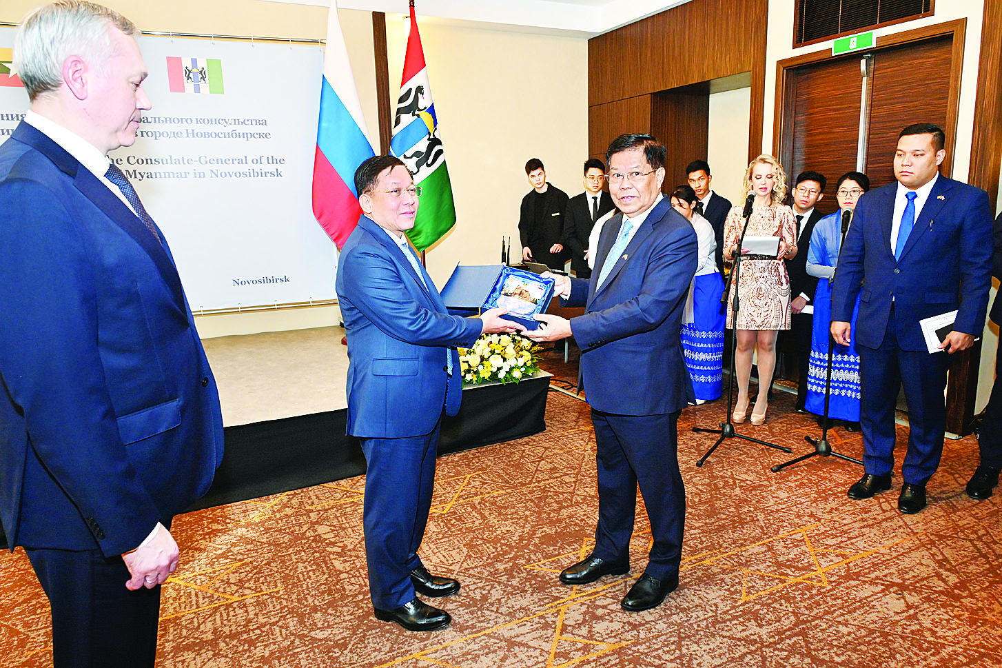ရုရှားဖက်ဒရေးရှင်းနိုင်ငံ နိုဗိုစီဗစ်မြို့၊ ကောင်စစ်ဝန်ချုပ်ရုံးဖွင့်ပွဲ အခမ်းအနားကို ယနေ့ဒေသစံတော်ချိန် နံနက်ပိုင်းတွင် Grand Autograph ဟိုတယ်၌ ကျင်းပပြုလုပ်ရာ ရုရှားနိုင်ငံသို့ တရားဝင်ချစ်ကြည်ရေးခရီး ရောက်ရှိနေသည့် နိုင်ငံတော်စီမံအုပ်ချုပ်ရေးကောင်စီဥက္ကဋ္ဌ နိုင်ငံတော်ဝန်ကြီးချုပ် ဗိုလ်ချုပ်မှူးကြီး မင်းအောင်လှိုင် တက်ရောက်ဖွင့်လှစ်ပေးသည်။
