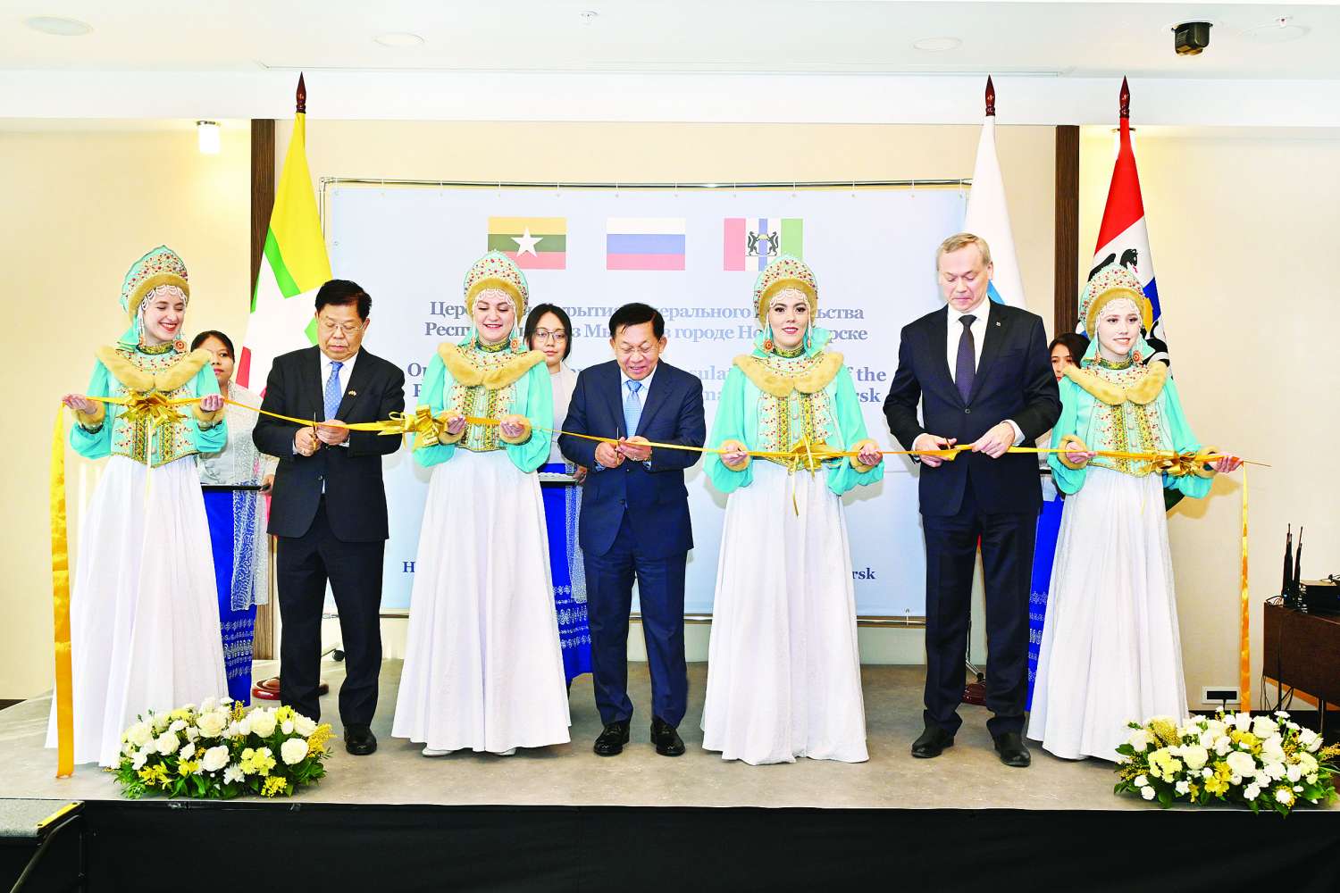 ထို့နောက် နိုင်ငံတော်စီမံအုပ်ချုပ်ရေးကောင်စီဥက္ကဋ္ဌ နိုင်ငံတော်ဝန်ကြီးချုပ် ဗိုလ်ချုပ်မှူးကြီး မင်းအောင်လှိုင်၊ ဒုတိယဝန်ကြီးချုပ်နှင့် နိုင်ငံခြားရေးဝန်ကြီးဌာန ပြည်ထောင်စုဝန်ကြီး ဦးသန်းဆွေနှင့် နိုဗိုစီဗစ်ဒေသ အုပ်ချုပ်ရေးမှူး မစ္စတာတရာ့ဗနီကော့ဗ်အန်ဒရေ အလက်ဇန်ဒရိုဘစ်ချ်တို့က ကောင်စစ်ဝန်ချုပ်ရုံးအား ဖဲကြိုးဖြတ်ဖွင့်လှစ်ပေးသည်။