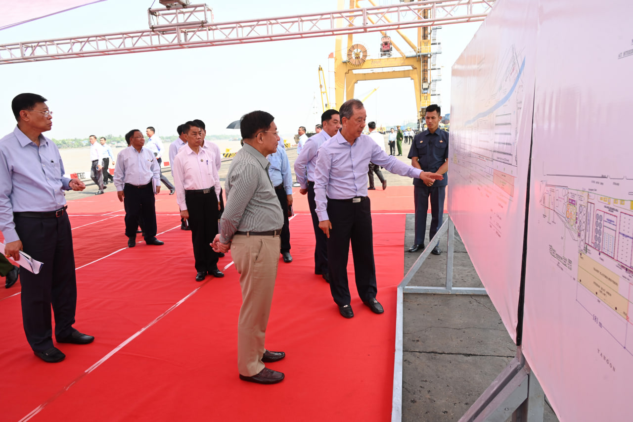 နိုင်ငံတော်စီမံအုပ်ချုပ်ရေးကောင်စီဥက္ကဋ္ဌ နိုင်ငံတော်ဝန်ကြီးချုပ် ဗိုလ်ချုပ်မှူးကြီး မင်းအောင်လှိုင် ဆိပ်ကမ်းလုပ်ငန်းကဏ္ဍစွမ်းဆောင်နိုင်မှုအခြေအနေများနှင့် ကုန်သွယ်မှုဆိုင်ရာအခြေအနေများအား သွားရောက်ကြည့်ရှုစစ်ဆေး