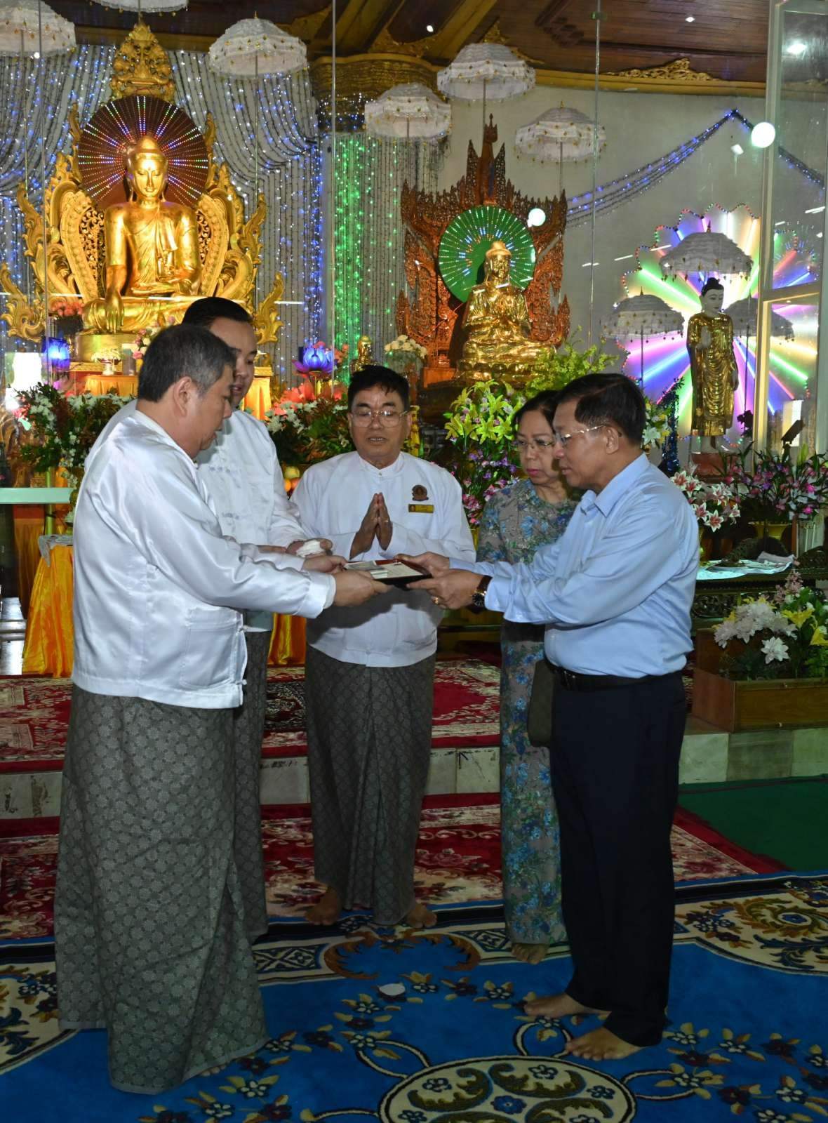 ယင်းနောက် နိုင်ငံတော်စီမံအုပ်ချုပ်ရေးကောင်စီဥက္ကဋ္ဌ နိုင်ငံတော်ဝန်ကြီးချုပ် နှင့် ဇနီး၊ အဖွဲ့ဝင်များသည် ပဉ္စမသင်္ဂါယနာတင်၊ ဘဝရှင် မင်းတုန်းမင်းတရားကြီး တည်ထားကိုးကွယ်တော်မူသော မဟာသကျမာရဇိန် ကျောက်တော်ကြီးဘုရားသို့ ရောက်ရှိ ဖူးမြော်ကြည်ညိုကြပြီး ပန်း၊ ရေချမ်း ကပ်လှူပူဇော်သည်။ ထို့နောက် နိုင်ငံတော်စီမံအုပ်ချုပ်ရေးကောင်စီဥက္ကဋ္ဌ နိုင်ငံတော်ဝန်ကြီးချုပ်နှင့် ဇနီးတို့က ဘုရားကြီး ဘက်စုံပြုပြင်မွမ်းမံရန်အတွက် အလှူတော်ငွေများကို ပေးအပ်လှူဒါန်းရာ ဂေါပကအဖွဲ့ ဥက္ကဋ္ဌနှင့် တာဝန်ရှိသူများက လက်ခံရယူသည်။ ယင်းနောက် ဘုရားကြီးအား လက်ယာရစ်လှည့်လည် ဖူးမြော်ကြည်ညိုခဲ့ပြီး ဘုရားကြီး ရေရှည်တည်တံ့ ခိုင်မြဲရေးအတွက် လိုအပ်သည်များ လမ်းညွှန်မှာကြားသည်။