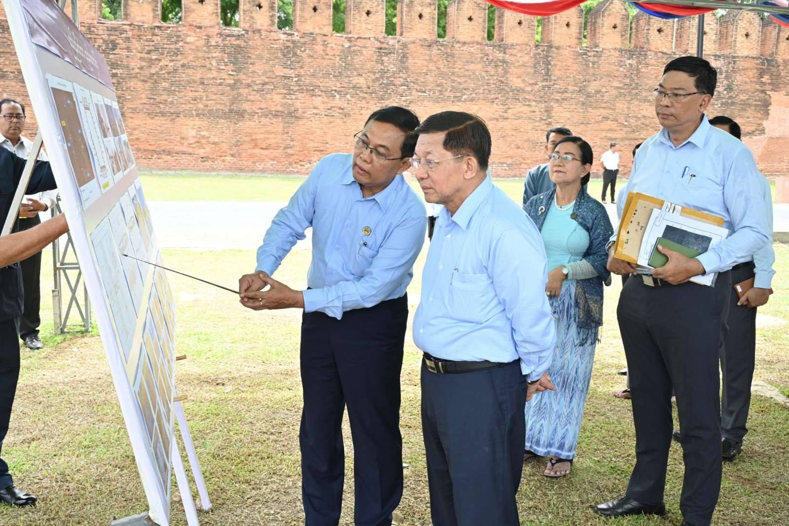ဆက်လက်၍ နိုင်ငံတော်စီမံအုပ်ချုပ်ရေးကောင်စီဥက္ကဋ္ဌ နိုင်ငံတော်ဝန်ကြီးချုပ်နှင့် အဖွဲ့ဝင်များသည် မန္တလေးနန်းမြို့တွင်းရှိ မြနန်းစံကျော် ရွှေနန်းတော်ကြီး ထိန်းသိမ်းထားရှိမှု အခြေအနေများကို သွားရောက် ကြည့်ရှုစစ်ဆေးရာ သာသနာရေးနှင့်ယဉ်ကျေးမှုဝန်ကြီးဌာန ဒုတိယဝန်ကြီး ဒေါ်နုမြဇံ နှင့် တာဝန်ရှိသူများက ရွှေနန်းတော်ကြီးနှင့် အဆောင်တော်များ ထိန်းသိမ်းထားရှိမှု အခြေအနေများနှင့် ၂၀၂၃ ခုနှစ် မေလအတွင်း နိုင်ငံတော်စီမံအုပ်ချုပ်ရေးကောင်စီဥက္ကဋ္ဌ နိုင်ငံတော်ဝန်ကြီးချုပ် လာရောက် စစ်ဆေးစဉ် လမ်းညွှန်မှာကြားချက်များအား လိုက်နာဆောင်ရွက်ထားရှိမှု အခြေအနေများကို ရှင်းလင်းတင်ပြကြရာ နိုင်ငံတော်စီမံအုပ်ချုပ်ရေးကောင်စီဥက္ကဋ္ဌ နိုင်ငံတော်ဝန်ကြီးချုပ်က လိုအပ်သည်များ မှာကြားသည်။