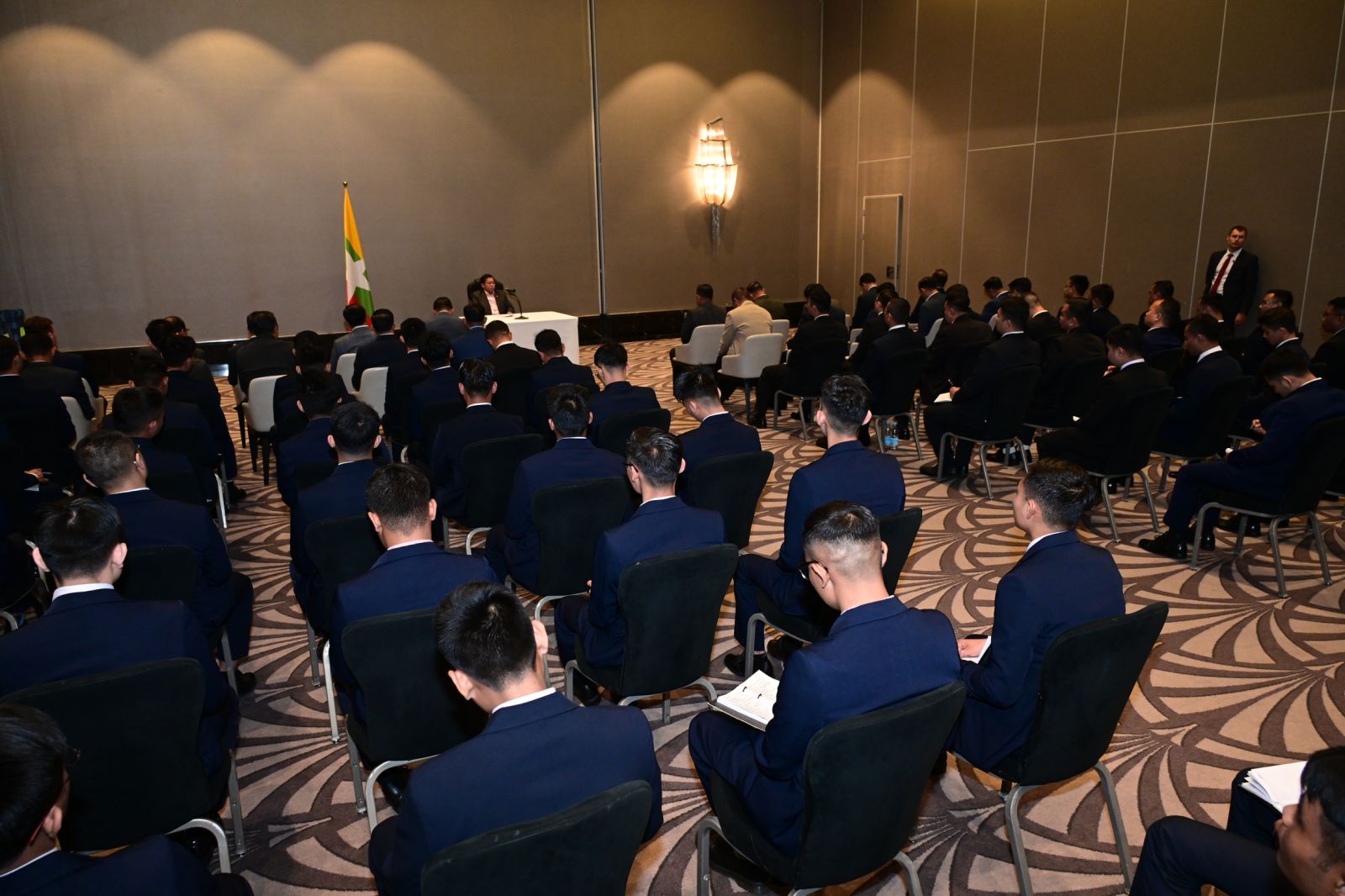 မိမိတို့အနေဖြင့် ရွေးကောက်ပွဲမဲမသမာမှုများကြောင့် ၂၀၂၁ ခုနှစ်တွင် နိုင်ငံတော်အား တာဝန်ယူဆောင်ရွက်ခဲ့ရခြင်းဖြစ်ကြောင်း၊ ထို့ကြောင့် ရွေးကောက်ပွဲ ပြန်လည်ကျင်းပ၍ လွှတ်တော်ခေါ်ယူ ဆောင်ရွက်ခြင်းသည် နိုင်ငံရေးအရအကောင်းဆုံးဖြေရှင်းခြင်းပင်ဖြစ်ကြောင်း၊ လွတ်လပ်၍တရားမျှတသည့် ပါတီစုံဒီမိုကရေစီအထွေထွေရွေးကောက်ပွဲကို မကြာမီ ကျင်းပသွားမည်ဖြစ်ပြီး ဆန္ဒမဲပေးပိုင်ခွင့်ရှိသူ အားလုံးဆန္ဒမဲပေးနိုင်ရေး နိုင်ငံတော်အစိုးရအနေဖြင့် ဆောင်ရွက်ပေးသွားမည်ဖြစ်ကြောင်း၊ ဒီမိုကရေစီကို တန်ဖိုးထားသူများအနေဖြင့် ဆန္ဒမဲပေးရာတွင် ပါဝင်လာကြမည်ဖြစ်ကြောင်း၊ မိမိတို့အနေဖြင့် လွတ်လပ်ပြီးတရားမျှတသည့် ရွေးကောက်ပွဲဖြစ်စေရေး ကြိုတင်ပြင်ဆင်ခြင်းလုပ်ငန်းများကို ဆောင်ရွက်လျက်ရှိကြောင်း၊ သင်တန်းသားအရာရှိများအနေဖြင့် နိုင်ငံတော်၏ ဖြစ်ပေါ်ပြောင်းလဲမှု အခြေအနေများနှင့် နိုင်ငံရေးဖြစ်စဉ် ဖြစ်ရပ်များကို မှန်မှန်ကန်ကန်သိရှိနိုင်ရန် လိုအပ်မည်ဖြစ်ကြောင်းမှာကြားပြီး နိုင်ငံတော်၏နိုင်ငံရေးဖြစ်ပေါ် ပြောင်းလဲမှုအခြေအနေများနှင့်ပတ်သက်၍ အကျယ်တဝင့် ဆွေးနွေးပြောကြားသည်။