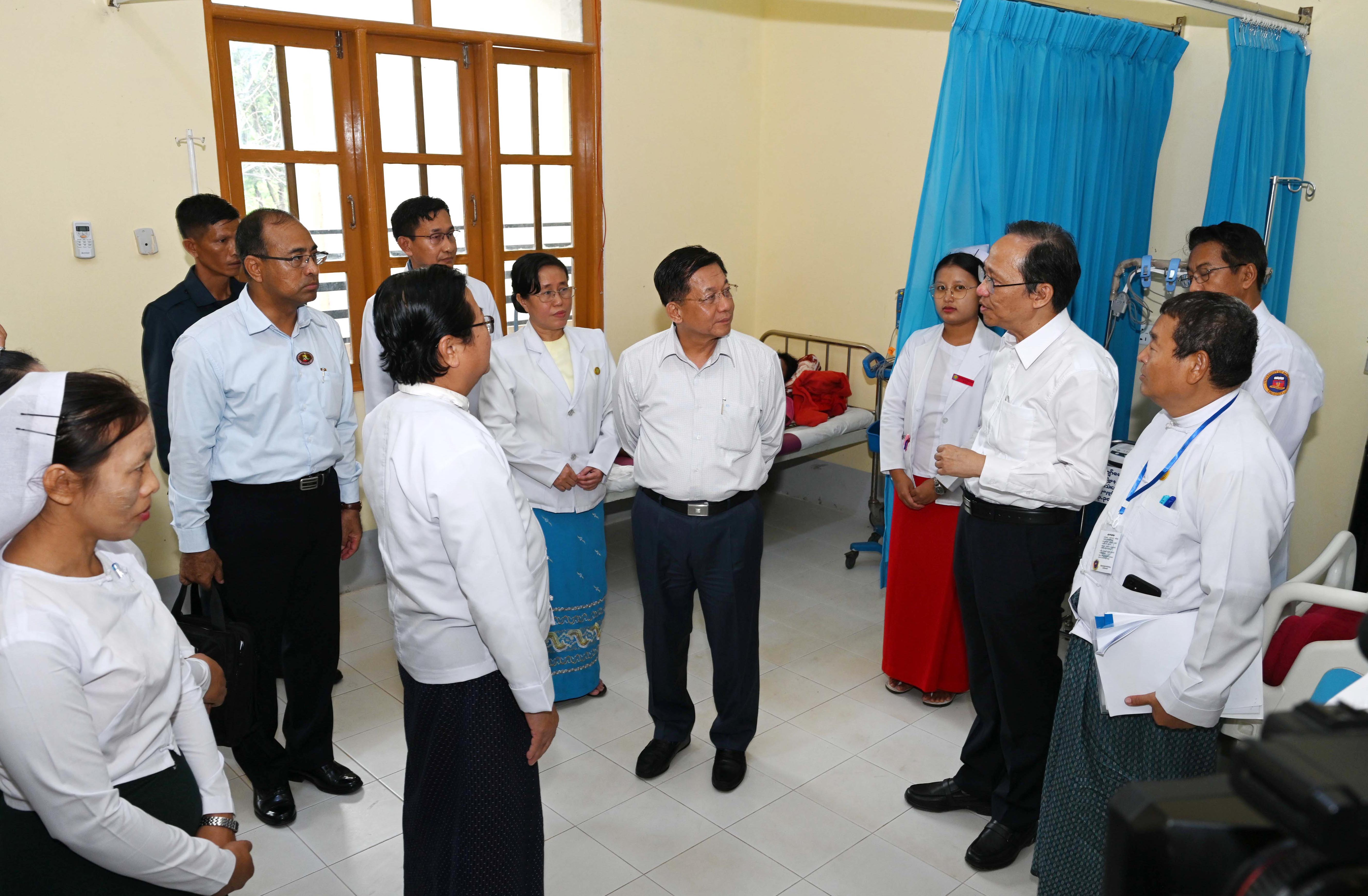 ယင်းနောက် နိုင်ငံတော်စီမံအုပ်ချုပ်ရေးကောင်စီဥက္ကဋ္ဌ နိုင်ငံတော်ဝန်ကြီးချုပ်သည် အရေးပေါ်ကုသဆောင်တွင် တက်ရောက်ကုသမှုခံယူလျက်ရှိသည့် ဒေသခံ ပြည်သူများကို ကြည့်ရှု၍ ကျန်းမာရေးအခြေအနေများကို မေးမြန်း အားပေးစကားပြောကြားပြီး စားသောက်ဖွယ်ရာများ ပေးအပ်သည်။