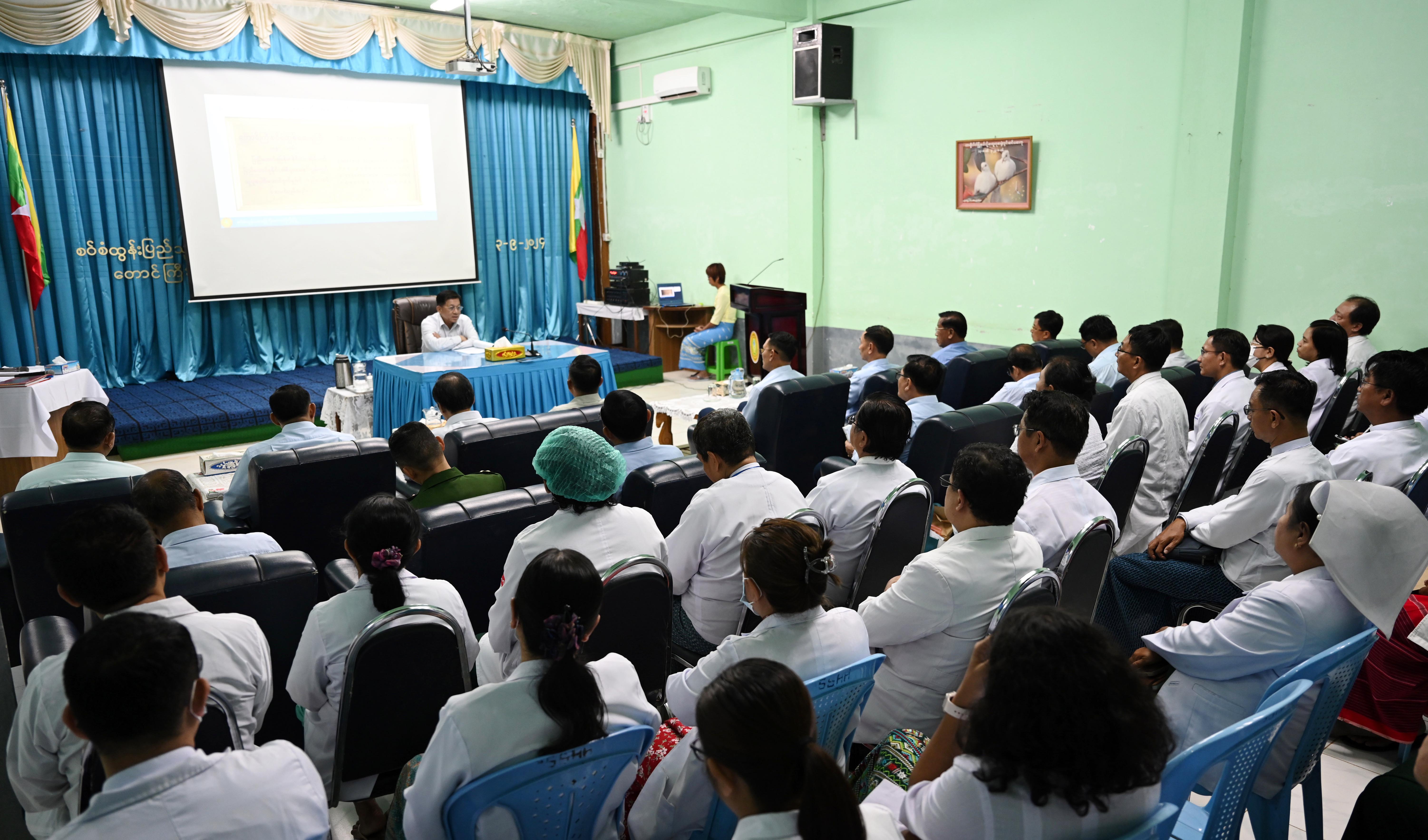 ထို့နောက် ဆေးရုံကြီးအစည်းအဝေးခန်းမတွင် ဆေးရုံအုပ်ကြီး ဒေါက်တာ ဝင်းမော်ဦးက ဆေးရုံ၏ သမိုင်းအကျဉ်း၊ အဆောက်အဦများ ဆောက်လုပ်ထားရှိမှုနှင့် လူနာဆောင်သစ်များ ဆောက်လုပ်ထားရှိမှု၊ ကင်ဆာရောဂါကုသရေးလုပ်ငန်းများ ဆောင်ရွက်လျက်ရှိမှု၊ လအလိုက် ဆေးကုသမှုလုပ်ငန်းများ ဆောင်ရွက်နေမှု၊ အထူးကြပ်မတ်ကုသမှုများ ဆောင်ရွက်နိုင်မှု၊ ဓာတ်မှန်လုပ်ငန်းများ ဆောင်ရွက်နိုင်မှု၊ ဓာတ်ရောင်ခြည်ကုသမှုများ ဆောင်ရွက်နိုင်မှုနှင့် ကင်ဆာကုသခြင်းလုပ်ငန်းအတွက် စက်ကိရိယာများ ထပ်မံလိုအပ်မှု အခြေအနေများကို ရှင်းလင်းတင်ပြသည်။