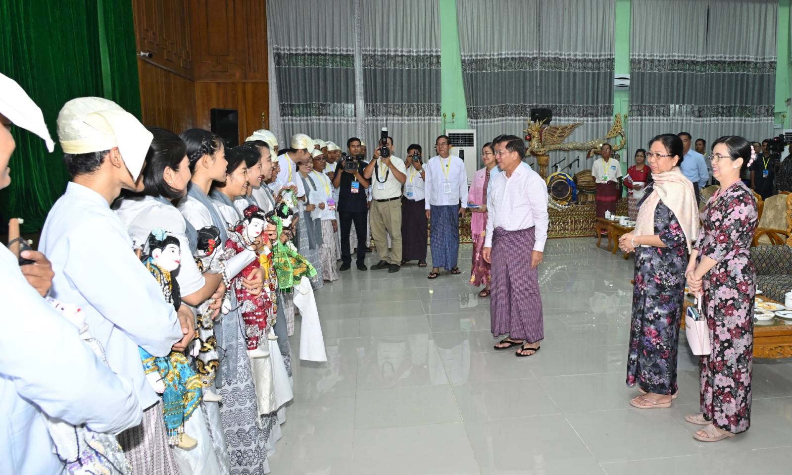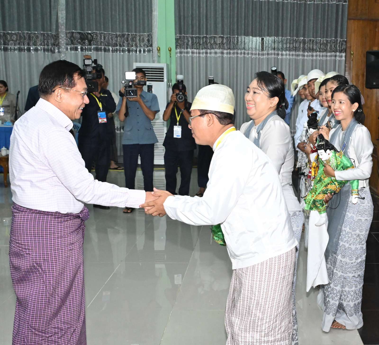 နိုင်ငံတော်စီမံအုပ်ချုပ်ရေးကောင်စီဥက္ကဋ္ဌ နိုင်ငံတော်ဝန်ကြီးချုပ်နှင့်ဇနီးတို့သည် ရုပ်စုံသဘင်အဖွဲ့လိုက် အကဲဖြတ်ဒိုင်အဖွဲ့ဝင်များနှင့် ပြိုင်ပွဲဝင်များကို ရင်းရင်းနှီးနှီး လိုက်လံနှုတ်ဆက်ကြသည်။