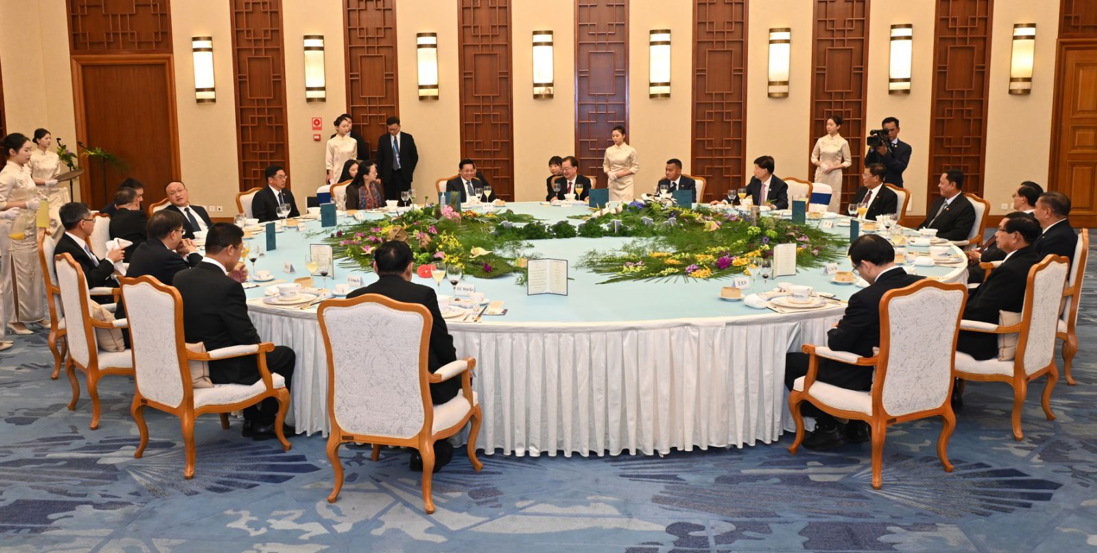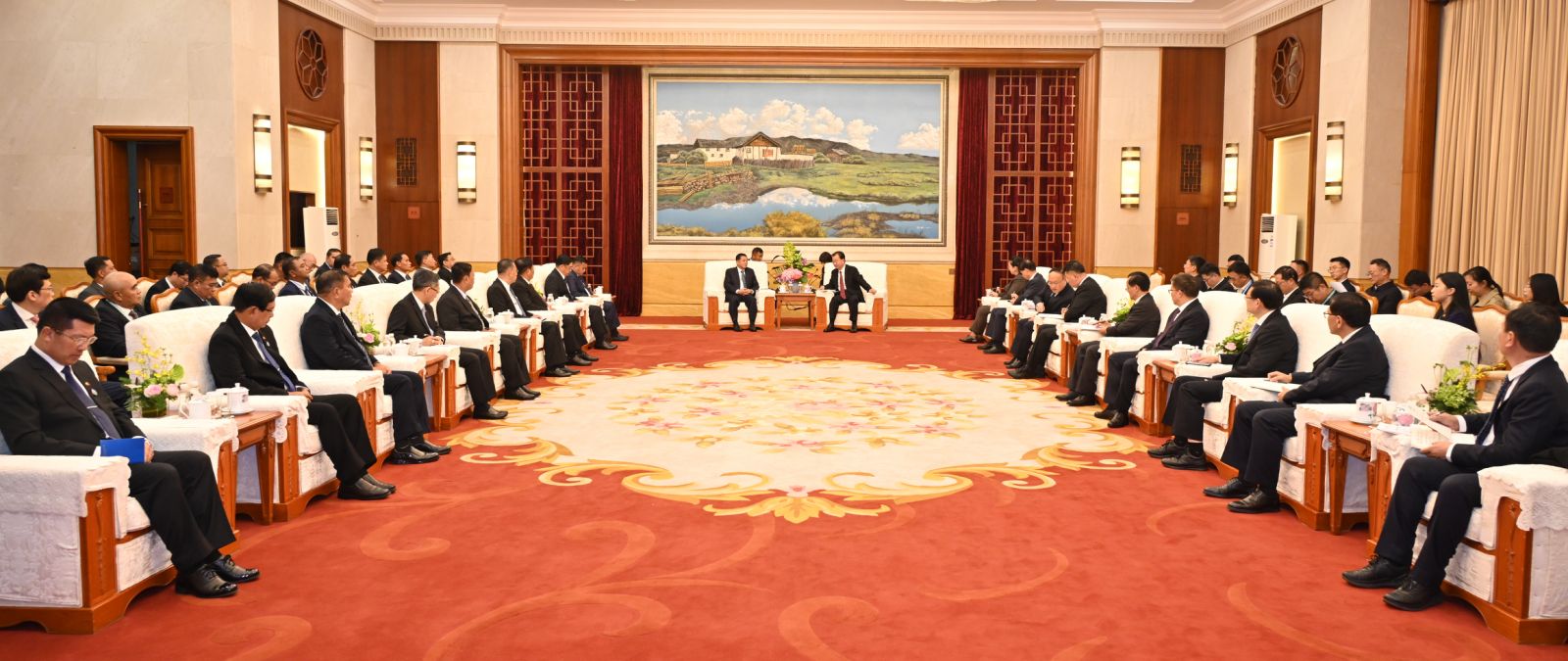ဦးစွာ နိုင်ငံတော်စီမံအုပ်ချုပ်ရေးကောင်စီဥက္ကဋ္ဌ နိုင်ငံတော်ဝန်ကြီးချုပ်နှင့်အဖွဲ့ဝင်များအား တရုတ်ပြည်သူ့သမ္မတနိုင်ငံ၊ တရုတ်ကွန်မြူနစ်ပါတီ၊ ဗဟိုကော်မတီအဖွဲ့ဝင်နှင့် ယူနန်ပြည်နယ်ပါတီ ကော်မတီအတွင်းရေးမှူးက လှိုက်လှဲနွေးထွေးစွာ ကြိုဆိုနှုတ်ဆက်ပြီး မှတ်တမ်းတင်ဓာတ်ပုံရိုက်ကြသည်။