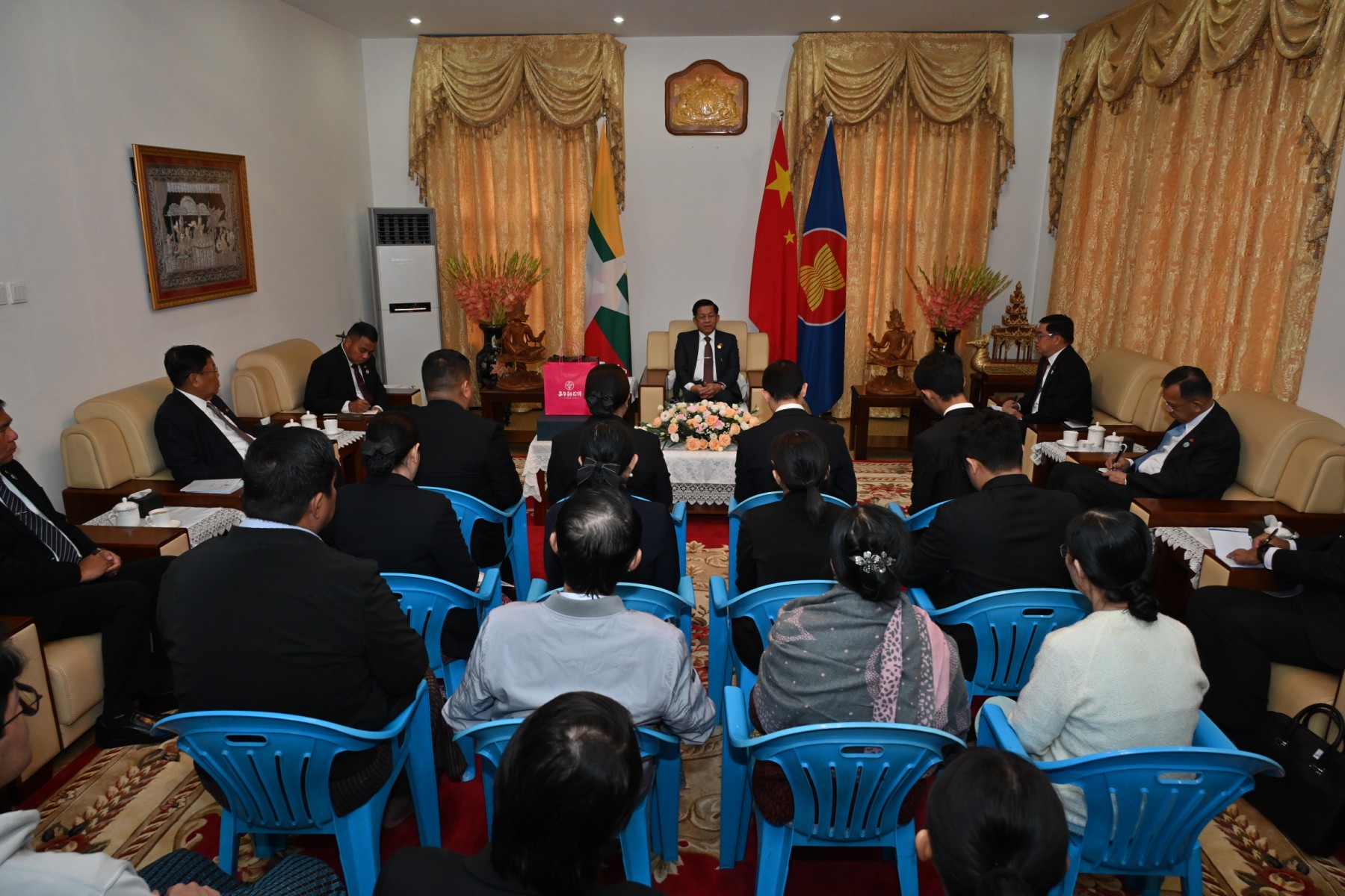 ယင်းနောက် နိုင်ငံတော်စီမံအုပ်ချုပ်ရေးကောင်စီဥက္ကဋ္ဌ နိုင်ငံတော်ဝန်ကြီးချုပ် က အမှာစကားပြောကြားရာ၌ တရုတ်ပြည်သူ့သမ္မတနိုင်ငံအစိုးရ၏ဖိတ်ကြားချက်အရ အဋ္ဌမအကြိမ်မြောက် မဟာမဲခေါင်ဒေသခွဲ ထိပ်သီးအစည်းအဝေးနှင့် အခြားသော အစည်းအဝေးများကိုတက်ရောက်ရန် ရောက်ရှိနေစဉ်အတွင်း နိုင်ငံတော်၏ တာဝန်များကို ရေခြား၊ မြေခြား၌ ထမ်းဆောင်နေကြသည့် ဝန်ထမ်းများအား လိုအပ်သည်များ မှာကြားနိုင်ရန် လာရောက်တွေ့ဆုံခြင်းဖြစ်ကြောင်း၊ နိုင်ငံရပ်ခြားတွင် မိမိတို့နိုင်ငံတော်၏ တာဝန်များကို အတူတကွ လာရောက် ထမ်းဆောင်နေကြခြင်းဖြစ်သည့်အတွက် တစ်ဦးနှင့်တစ်ဦး ဖေးမကူညီစောင့်ရှောက်ကြရန်နှင့် မိမိတို့၏ လုပ်ငန်းတာဝန်များကို ကျေပွန်အောင် ဝိုင်းဝန်းဆောင်ရွက်ကြရန်လိုကြောင်း၊ မိမိတို့တာဝန်ထမ်းဆောင်ရသည့် နိုင်ငံ၏သမိုင်းကြောင်းနှင့် အလေ့အထများ၊ ဖွံ့ဖြိုးတိုးတက်မှုများကို မျက်ခြည်မပြတ် လေ့လာ၍ လိုအပ်သည်များကို သင်ခန်းစာယူကာ မိမိတို့နိုင်ငံဖွံ့ဖြိုးတိုးတက်ရေးကိုလည်း မည်ကဲ့သို့ ဆောင်ရွက်နိုင်မည်ကို အဖြေရှာဆောင်ရွက်ကြရန်လိုကြောင်း၊ နိုင်ငံတစ်နိုင်ငံဖွံ့ဖြိုးတိုးတက်ရေးအတွက် စီးပွားရေးမောင်းနှင်အားသည် အဓိကကျသောကြောင့် နှစ်နိုင်ငံ အကျိုးတူ စီးပွားရေးလုပ်ငန်းများ၊ ပို့ကုန်သွင်းကုန်လုပ်ငန်းများ အခွင့်အလမ်းရရှိစေရေး သံတမန် ဆက်ဆံရေးမှတစ်ဆင့် ဝိုင်းဝန်းဆောင်ရွက်ကြရန်လိုကြောင်း၊ သံတမန်လုပ်ငန်းတာဝန်များကို ထမ်းဆောင်ရာ၌ ပေါင်းသင်းဆက်ဆံမှု ကောင်းခြင်းသည် လုပ်ငန်းတာဝန်များ ပိုမိုအဆင်ပြေချောမွေ့စွာအောင်မြင်နိုင်မည်ဖြစ်ကြောင်း။