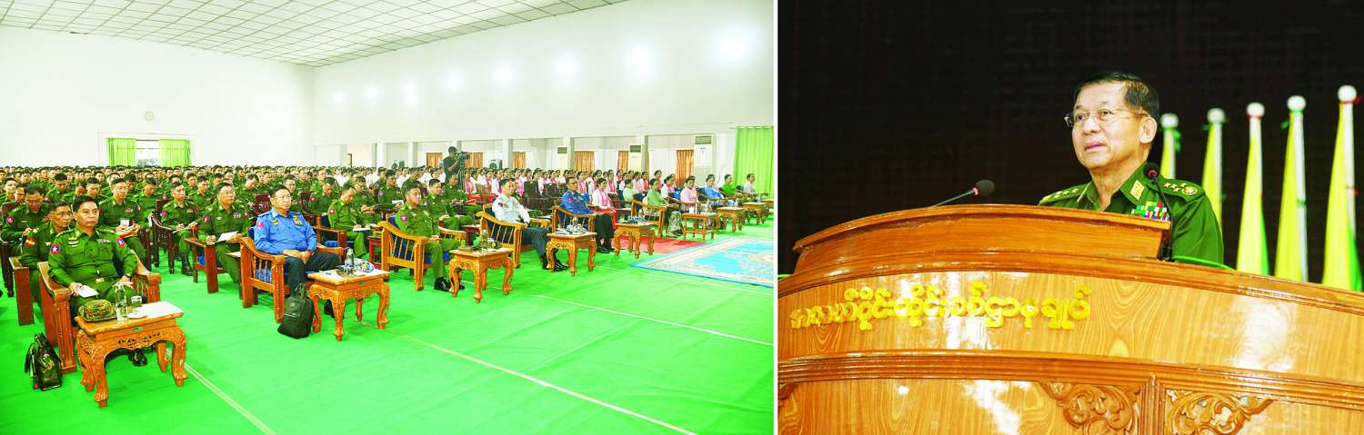 နိုင်ငံတော်တွင်ဖြစ်ပေါ်လျက်ရှိသည့် ဆူပူအကြမ်းဖက်ဖြစ်စဉ်များကြောင့် လုံခြုံရေးတပ်ဖွဲ့ဝင်များ၊ နိုင်ငံ့ဝန်ထမ်းများ၊ ပြည်သူလူထုများ အသက်ခန္ဓာဆုံးရှုံးခဲ့ကြရသကဲ့သို့ နိုင်ငံတော်ဖွံ့ဖြိုးတိုးတက်ရေးအတွက် ဆောင်ရွက်ထားသည့် လမ်းတံတားများ၊ စက်ရုံအလုပ်ရုံများ၊ အဆောက်အဦများ များစွာပျက်စီးဆုံးရှုံး ထိခိုက်နစ်နာခဲ့ရကြောင်း၊ ထိုကဲ့သို့နိုင်ငံတော်မှ ထိခိုက်နစ်နာရသကဲ့သို့ ပြည်သူတစ်ဦးချင်း အနေဖြင့်လည်း လူမှုရေး၊ စီးပွားရေးအရ ထိခိုက်နစ်နာခဲ့ရခြင်းများရှိခဲ့ကြောင်း၊ အကြမ်းဖက်မှုဖြစ်စဉ်များအပေါ် ပြည်သူလူထု၊ အစိုးရ၊ တပ်မတော်တို့၏ ပေါင်းစည်းအား၊ ညီညွတ်သော စိတ်ဓာတ်တို့ဖြင့် ကာကွယ်သွားရမည်ဖြစ်ကြောင်း၊ တပ်နယ်များအလိုက် မိမိတို့တာဝန်ထမ်းဆောင်ရသည့် ဒေသအတွင်း အကြမ်းဖက်မှုများမရှိစေရေး၊ လက်နက်ကိုင်၍ ပြည်သူလူထုကို အနိုင်ကျင့်နေမှုများ မရှိစေရေး နယ်မြေလုံခြုံရေးတာဝန်များကို စနစ်တကျဆောင်ရွက်သွားရန်လိုကြောင်း၊ တပ်မတော်သားများအနေဖြင့်လည်း တပ်တွင်းစည်းလုံးညီညွတ်ရေးခိုင်မာမှုမှသည် တပ်ပြင်စည်းရုံးရေးကို တည်ဆောက်၍ တပ်နှင့်ပြည်သူ တစ်သားတည်းဖြစ်အောင် တည်ဆောက်ထားရှိရန်လိုကြောင်း၊ တပ်တွင်း၊ တပ်ပြင်အင်အားများကို တည်ဆောက်၍ စုစည်းညီညွတ်သည့်အားဖြင့် မိမိတို့တာဝန်ထမ်းဆောင်နေရသည့် ဒေသ၏ လုံခြုံရေး၊ တည်ငြိမ်အေးချမ်းရေး၊ တရားဥပဒေစိုးမိုးရေးနှင့် လူမှုစီးပွားဘဝဖွံ့ဖြိုးတိုးတက်ရေးတို့ကို အတူတကွ ဝိုင်းဝန်းဆောင်ရွက်နေရမည်ဖြစ်ကြောင်း၊ မိမိတို့၏တာဝန်များကို မှန်မှန်ကန်ကန်ထမ်းဆောင်ပြီး ပြည်သူကလေးစားရသည့်၊ အားကိုးရသည့် စစ်သည်များဖြစ်အောင် နေထိုင်ကြရမည်ဖြစ်ကြောင်း။