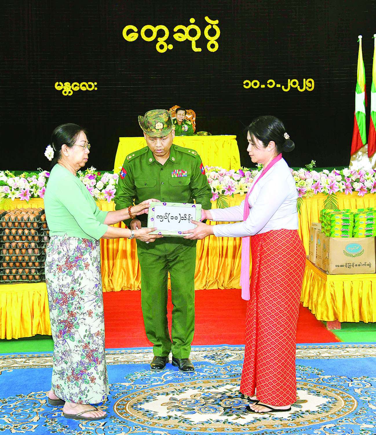 ထို့နောက် နိုင်ငံတော်စီမံအုပ်ချုပ်ရေးကောင်စီဥက္ကဋ္ဌ တပ်မတော်ကာကွယ်ရေးဦးစီးချုပ်က တပ်နယ်များမှ အရာရှိ၊ စစ်သည်၊ မိသားစုများအတွက် စားသောက်ဖွယ်ရာပစ္စည်းများကို ပေးအပ်ရာ မိတ္ထီလာ တပ်နယ်မှူးနှင့် တိုင်းမှူးကလည်းကောင်း၊ နိုင်ငံတော်စီမံအုပ်ချုပ်ရေးကောင်စီဥက္ကဋ္ဌ တပ်မတော်ကာကွယ်ရေးဦးစီးချုပ်၏ဇနီးက တပ်နယ်မိသားစုများအတွက် စားသောက်ဖွယ်ရာပစ္စည်းများကို ပေးအပ်ရာ တပ်နယ်မှူး၏ဇနီးနှင့် တိုင်းမှူး၏ ဇနီးတို့ကလည်းကောင်း အသီးသီး လက်ခံရယူကြသည်။