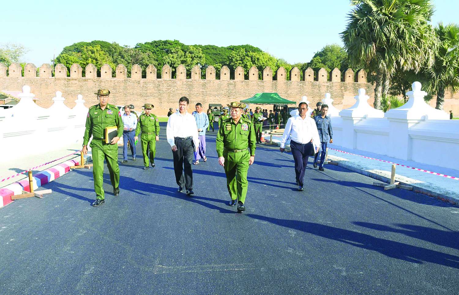 ယင်းနောက် နိုင်ငံတော်စီမံအုပ်ချုပ်ရေးကောင်စီဥက္ကဋ္ဌ တပ်မတော်ကာကွယ်ရေးဦးစီးချုပ်နှင့် အဖွဲ့ဝင်များသည် မန္တလေးနန်းမြို့ရိုးတစ်လျှောက် မော်တော်ယာဉ်များဖြင့် လိုက်လံကြည့်ရှုစစ်ဆေးခဲ့ကြောင်း သတင်းရရှိသည်။