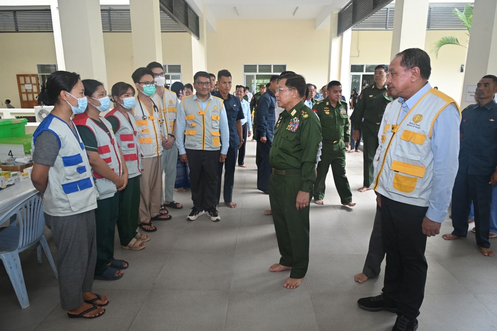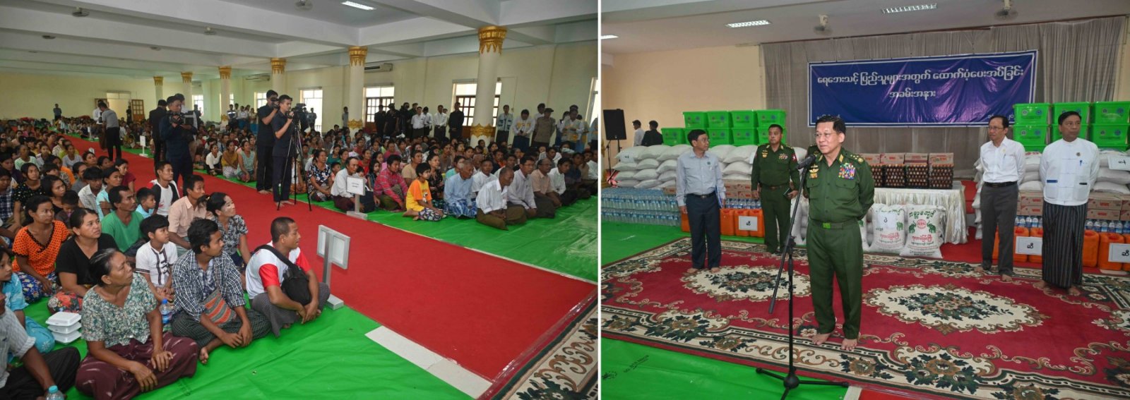 နိုင်ငံတော်စီမံအုပ်ချုပ်ရေးကောင်စီဥက္ကဋ္ဌ တပ်မတော်ကာကွယ်ရေးဦးစီးချုပ် ဗိုလ်ချုပ်မှူးကြီး မင်းအောင်လှိုင် ပျဉ်းမနားမြို့နယ်၊ မင်္ဂလာဗျူဟာသာသနာ့ဗိမာန် ရေဘေးရှောင် ကယ်ဆယ်ရေးစခန်းရှိ ရေဘေးရှောင် ပြည်သူများအား သွားရောက်အားပေး၊ ထောက်ပံ့ရေးပစ္စည်းများပေးအပ်