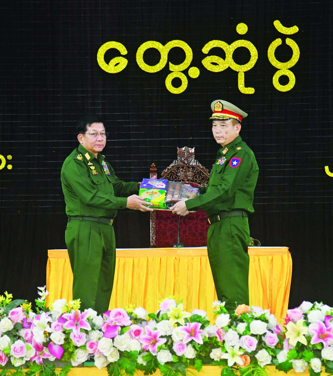 ယင်းနောက် နိုင်ငံတော်လုံခြုံရေးနှင့်အေးချမ်းသာယာရေးကော်မရှင်ဥက္ကဋ္ဌ တပ်မတော်ကာကွယ်ရေးဦးစီးချုပ်က အရာရှိ၊ စစ်သည်၊ မိသားစုများအတွက် စားသောက်ဖွယ်ရာပစ္စည်းများကို ပေးအပ်ရာ တိုင်းမှူးကလည်းကောင်း၊ နိုင်ငံတော်လုံခြုံရေးနှင့် အေးချမ်းသာယာရေးကော်မရှင်ဥက္ကဋ္ဌ တပ်မတော်ကာကွယ်ရေးဦးစီးချုပ်၏ ဇနီးက တပ်နယ်မိခင်နှင့် ကလေးစောင့်ရှောက်ရေးအသင်းအတွက် ချီးမြှင့်ငွေများကို ပေးအပ်ရာ တိုင်းမှူး၏ ဇနီးကလည်းကောင်း အသီးသီးလက်ခံရယူသည်။