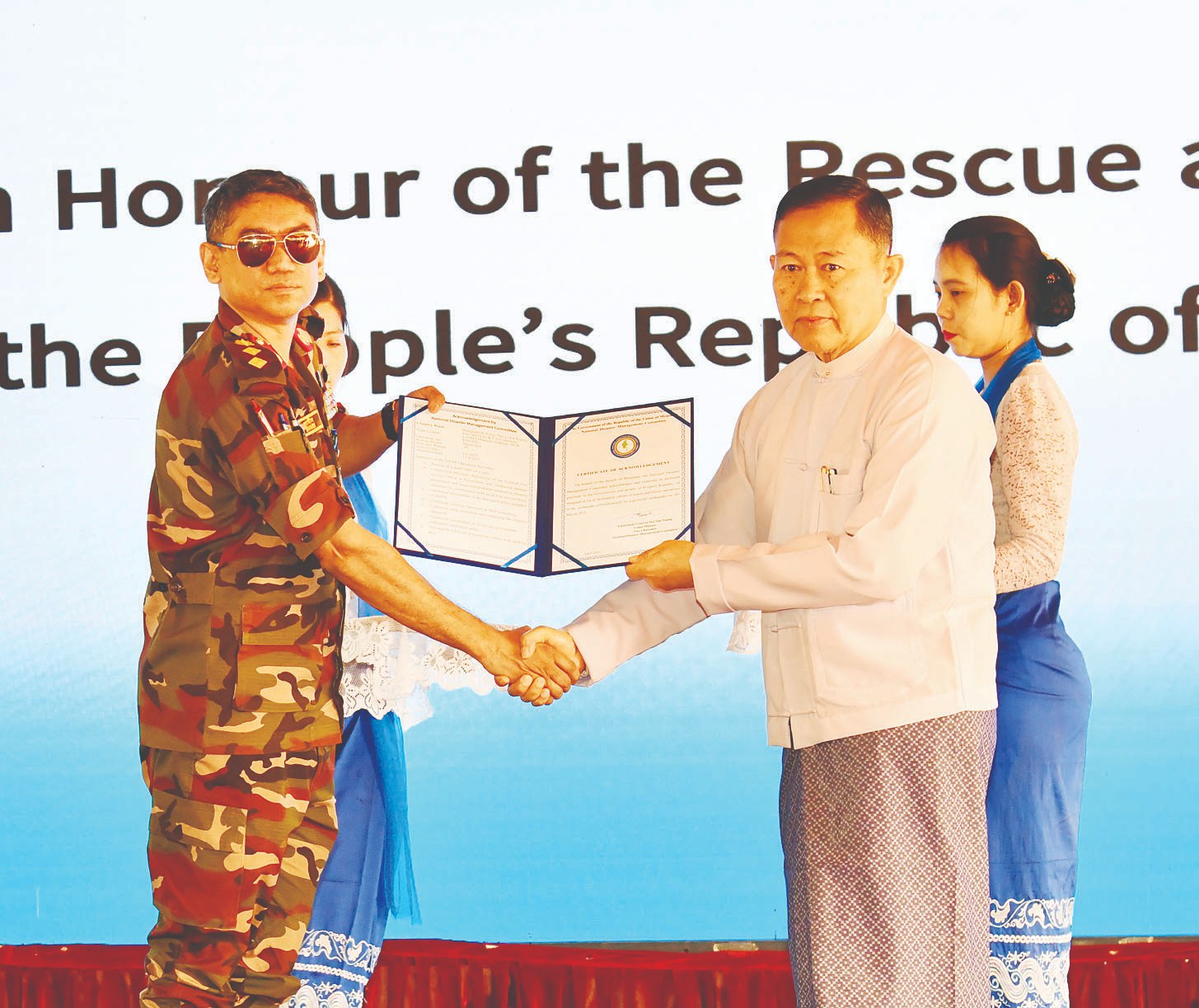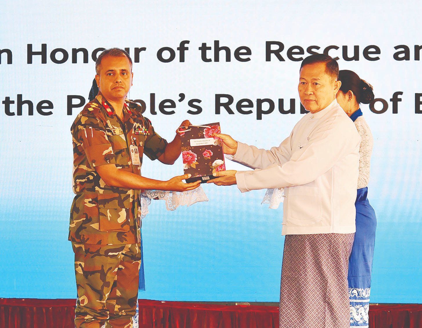 ထို့နောက် အမျိုးသားသဘာဝဘေးအန္တရာယ်ဆိုင်ရာ စီမံခန့်ခွဲမှုကော်မတီဥက္ကဋ္ဌ နိုင်ငံတော်စီမံအုပ်ချုပ်ရေးကောင်စီ ဒုတိယဥက္ကဋ္ဌ ဒုတိယဝန်ကြီးချုပ် ဒုတိယဗိုလ်ချုပ်မှူးကြီး စိုးဝင်းက ဘင်္ဂလားဒေ့ရှ်နိုင်ငံ ရှာဖွေကယ်ဆယ်ရေးနှင့် အရေးပေါ်ကျန်းမာရေးစောင့် ရှောက်မှုအဖွဲ့တို့ကို ဂုဏ်ပြုမှတ်တမ်းလွှာများနှင့် အမှတ်တရလက်ဆောင်များ ပေးအပ်ရာ အဖွဲ့များကိုယ်စား ကိုယ်စားလှယ်တစ်ဦးစီက လက်ခံရယူကြသည်။