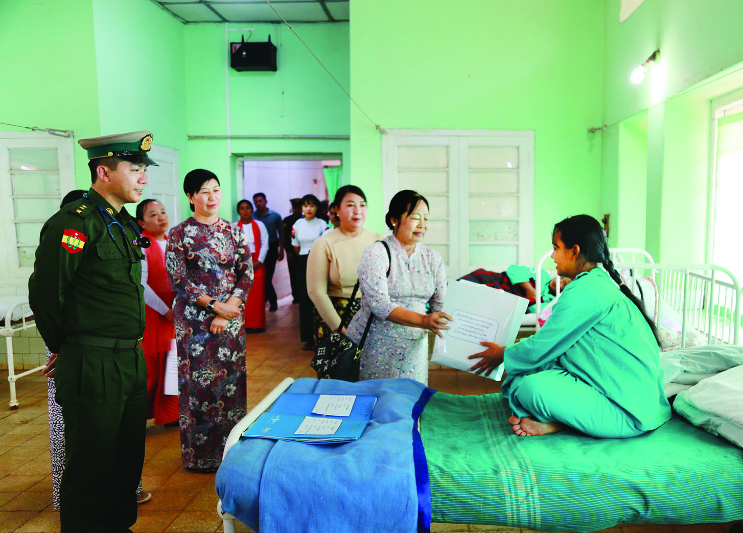 အလားတူ နိုင်ငံတော်စီမံ အုပ်ချုပ်ရေးကောင်စီ ဒုတိယဥက္ကဋ္ဌ ဒုတိယတပ်မတော် ကာကွယ်ရေးဦးစီးချုပ်ကာကွယ်ရေးဦးစီးချုပ် (ကြည်း)၏ဇနီး ဒေါ်သန်းသန်းနွယ် နှင့်အဖွဲ့ဝင်များသည် အမျိုးသမီးနှင့် ကလေးကုသဆောင်သို့ သွားရောက်၍ ဆေးရုံတက်ရောက်ကုသလျက်ရှိသည့် လူနာများအား လိုက်လံကြည့်ရှု အားပေးစကား ပြောကြားပြီး ထောက်ပံ့ပစ္စည်းများပေးအပ်သည်။