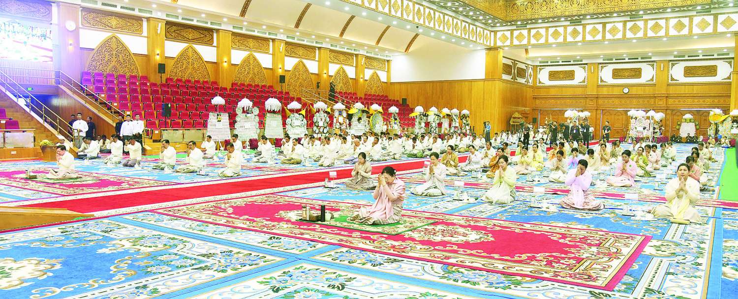 ဦးစွာ နိုင်ငံတော်ယာယီသမ္မတ နိုင်ငံတော်လုံခြုံရေးနှင့်အေးချမ်းသာယာရေးကော်မရှင်ဥက္ကဋ္ဌသည် အဂ္ဂါဓိပတိသာသနာ့ဗိမာန်တော်ကြီးအတွင်းရှိ မာရဝိဇယ နောင်တော်ကြီး ဗုဒ္ဓရုပ်ပွားတော်မြတ်အား ဖူးမြော်ကြည်ညို၍ မြသပိတ်ဆွမ်းတော်၊ ပန်း၊ ရေချမ်း၊ ဆီမီးနှင့် သစ်သီးတို့ကို ဆက်ကပ်လှူဒါန်းသည်။