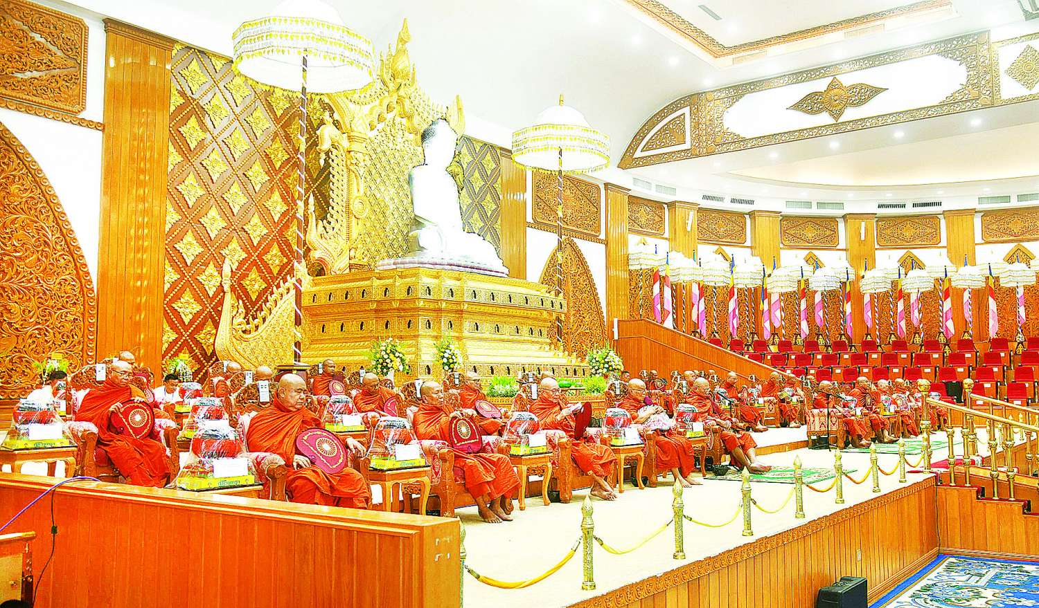 အခမ်းအနားသို့ နိုင်ငံတော်သံဃမဟာနာယကအဖွဲ့ဥက္ကဋ္ဌ သန်လျင်မြို့ မင်းကျောင်းပထမပြန်စာသင်တိုက် ပဓာနနာယက အဂ္ဂမဟာပဏ္ဍိတ အဂ္ဂမဟာသဒ္ဓမ္မ ဇောတိကဓဇ ဒေါက်တာ ဘဒ္ဒန္တ စန္ဒိမာဘိဝံသ၊ နိုင်ငံတော်သံဃမဟာနာယကအဖွဲ့အကျိုးတော်ဆောင် မန္တလေးမြို့ မစိုးရိမ်တိုက်သစ် မဟာနာယက ဓမ္မသမိဒ္ဓိကျောင်းဆရာတော် အဂ္ဂမဟာပဏ္ဍိတ အဂ္ဂမဟာသဒ္ဓမ္မဇောတိကဓဇ မဟာဓမ္မကထိက ဗဟုဇနဟိတဓရ ဘဒ္ဒန္တဝါသေဋ္ဌာဘိဝံသနှင့် ဥပ္ပါတသန္တိစေတီတော်ဂေါပကအဖွဲ့ ဩဝါဒါစရိယဆရာတော်ကြီးများ အမှူးပြုသည့် ပင့်ဖိတ်ထားသော ဆရာတော်ကြီး ၂၇ ပါး ကြွရောက်ချီးမြှင့်တော်မူကြပြီး နိုင်ငံတော်ယာယီသမ္မတ နိုင်ငံတော်လုံခြုံရေးနှင့်အေးချမ်းသာယာရေးကော်မရှင်ဥက္ကဋ္ဌ ဗိုလ်ချုပ်မှူးကြီး မင်းအောင်လှိုင်နှင့်ဇနီး ဒေါ်ကြူကြူလှတို့နှင့်အတူ ကော်မရှင်ဒုတိယဥက္ကဋ္ဌ ဒုတိယဗိုလ်ချုပ်မှူးကြီး စိုးဝင်းနှင့်ဇနီး ဒေါ်သန်းသန်းနွယ်၊ ကော်မရှင်အဖွဲ့ဝင် နိုင်ငံတော်ဝန်ကြီးချုပ် ဦးညိုစောနှင့်ဇနီး၊ ကော်မရှင်အဖွဲ့ဝင် အမှုဆောင်ချုပ် ဦးအောင်လင်းဒွေးနှင့် ဇနီး၊ ကော်မရှင်အတွင်းရေးမှူး တွဲဖက်အမှုဆောင်ချုပ် ဗိုလ်ချုပ်ကြီး ရဲဝင်းဦးနှင့် ဇနီး၊ ကော်မရှင်အဖွဲ့ဝင်များနှင့်ဇနီးများ၊ ပြည်ထောင်စုအဆင့်ပုဂ္ဂိုလ်များ၊ ပြည်ထောင်စုဝန်ကြီးများနှင့်ဇနီးများ၊ နေပြည်တော်ကောင်စီဥက္ကဋ္ဌ၊ ကာကွယ်ရေးဦးစီးချုပ်ရုံးမှ အဆင့်မြင့်တပ်မတော်အရာရှိကြီးများနှင့်ဇနီးများ၊ နေပြည်တော်တိုင်းစစ်ဌာနချုပ်တိုင်းမှူးနှင့် တာဝန်ရှိသူများ တက်ရောက်ကြသည်။