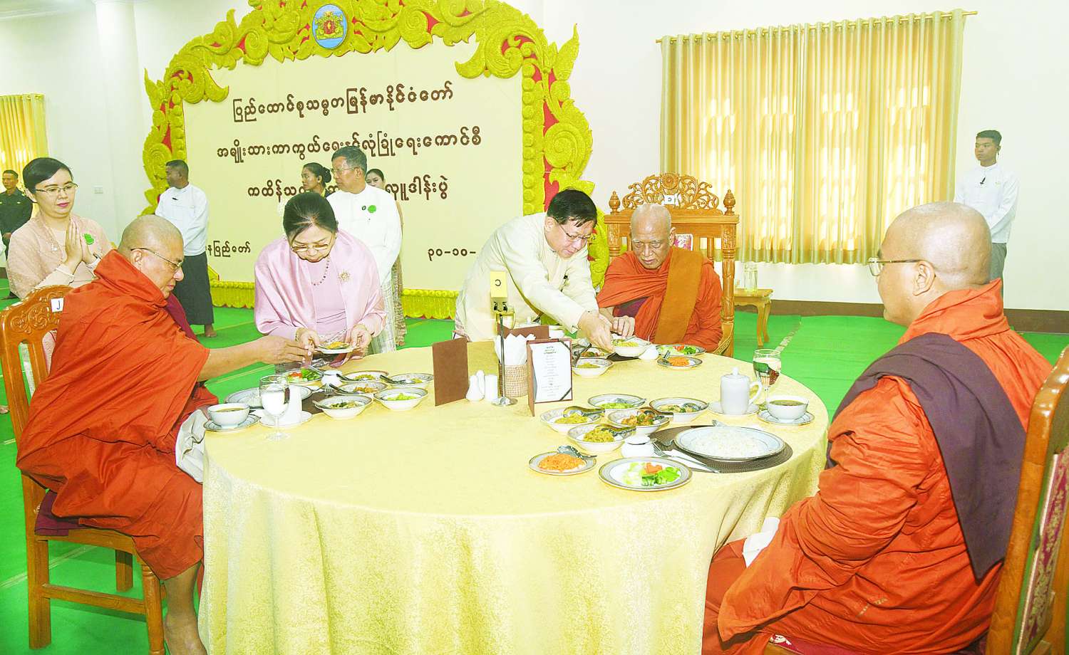 ယင်းနောက် “ဗုဒ္ဓသာသနံ စိရံတိဋ္ဌတု” သုံးကြိမ်ရွတ်ဆိုဆုတောင်း၍ အခမ်းအနားကို ရုပ်သိမ်းလိုက်သည်။ အခမ်းအနားအပြီးတွင် သန်လျင်မင်းကျောင်းဆရာတော်ကြီး အမှူးပြုသည့် ဆရာတော်၊ သံဃာတော်များအား နိုင်ငံတော်ယာယီသမ္မတ နိုင်ငံတော်လုံခြုံရေးနှင့်အေးချမ်းသာယာရေးကော်မရှင်ဥက္ကဋ္ဌနှင့် ဇနီး၊ ဧည့်ပရိသတ်များက နေ့ဆွမ်းဆက်ကပ်လှူဒါန်းခဲ့သည်။