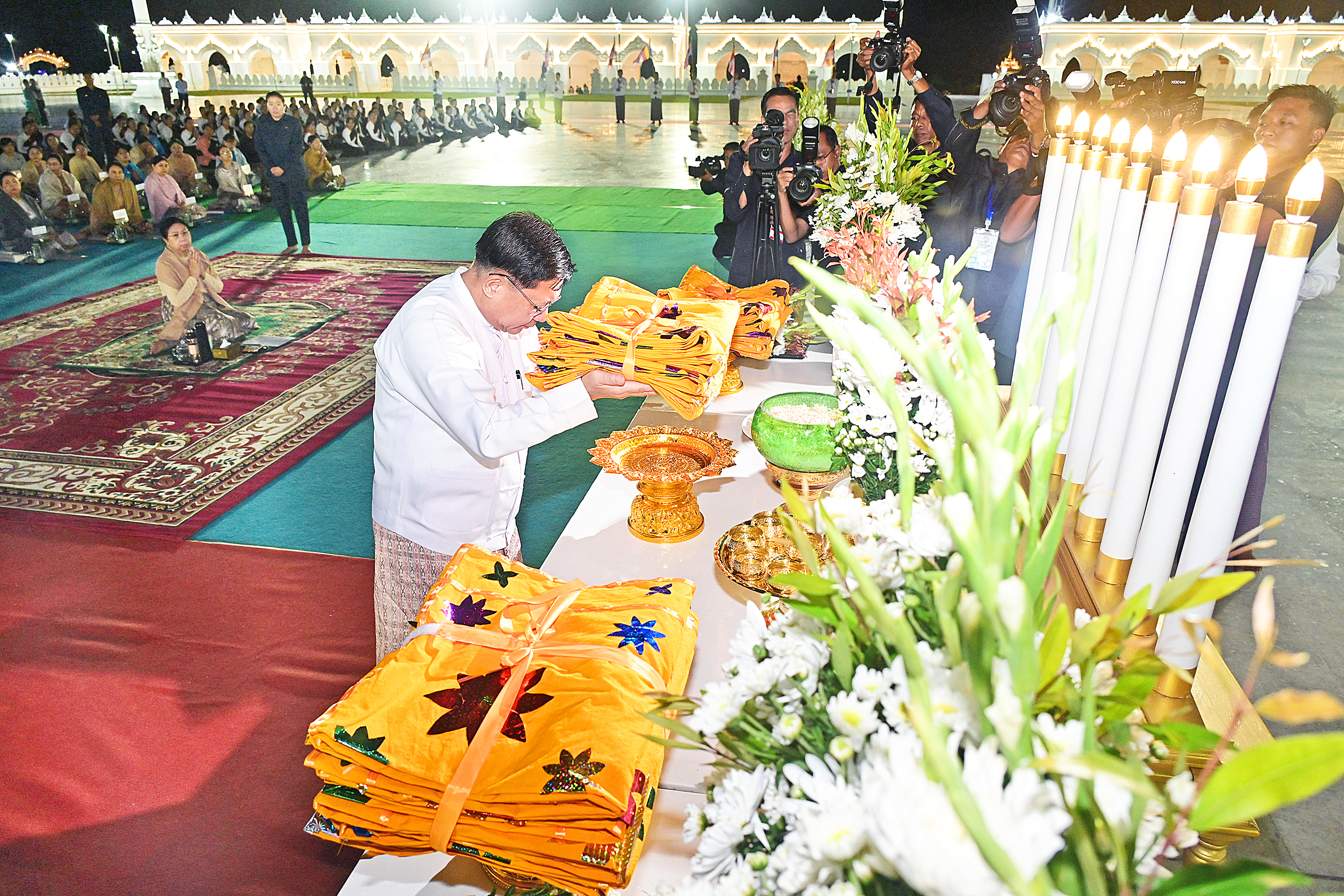 ဆက်လက်၍ နိုင်ငံတော်ယာယီသမ္မတ နိုင်ငံတော်လုံခြုံရေးနှင့်အေးချမ်းသာယာရေးကော်မရှင်ဥက္ကဋ္ဌက မာရဝိဇယဗုဒ္ဓရုပ်ပွားတော်မြတ်ကြီးအား ဖူးမြော်ကြည်ညို၍ မြသပိတ်ဆွမ်းတော်၊ သစ်သီးပန်းမန်၊ သောက်တော်ရေချမ်းနှင့် ဆီမီးများကပ်လှူပူဇော်ပြီး နေပြည်တော်ကောင်စီအပါအဝင် တိုင်းဒေသကြီးနှင့် ပြည်နယ်ကိုယ်စားပြု ရက်ကန်းအဖွဲ့ ၁၅ ဖွဲ့မှ ရက်လုပ်စပ်ချုပ် သီလွှမ်းထားသည့် မသိုးရွှေကြာသင်္ကန်းတော် ၁၅ ထည်ကို ဆက်ကပ်လှူဒါန်းသည်။