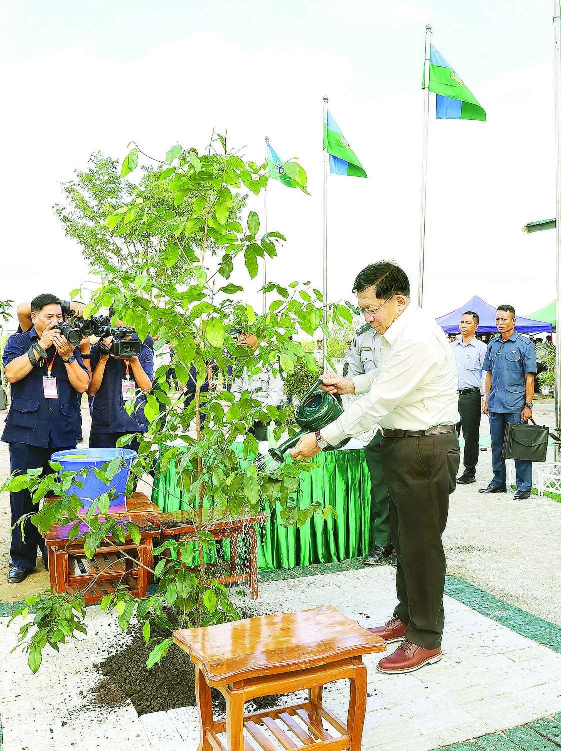 ပြည်ထောင်စုသမ္မတမြန်မာနိုင်ငံတော်ယာယီသမ္မတ နိုင်ငံတော်လုံခြုံရေးနှင့်အေးချမ်းသာယာရေးကော်မရှင်ဥက္ကဋ္ဌ ဗိုလ်ချုပ်မှူးကြီး မင်းအောင်လှိုင် ပြည်ထောင်စုနယ်မြေ နေပြည်တော် ၂၀၂၅ ခုနှစ် တတိယအကြိမ် မိုးရာသီသစ်ပင်စိုက်ပျိုးပွဲသို့ တက်ရောက်၍ ခရေပျိုးပင်အား ဦးဆောင်စိုက်ပျိုးပေး