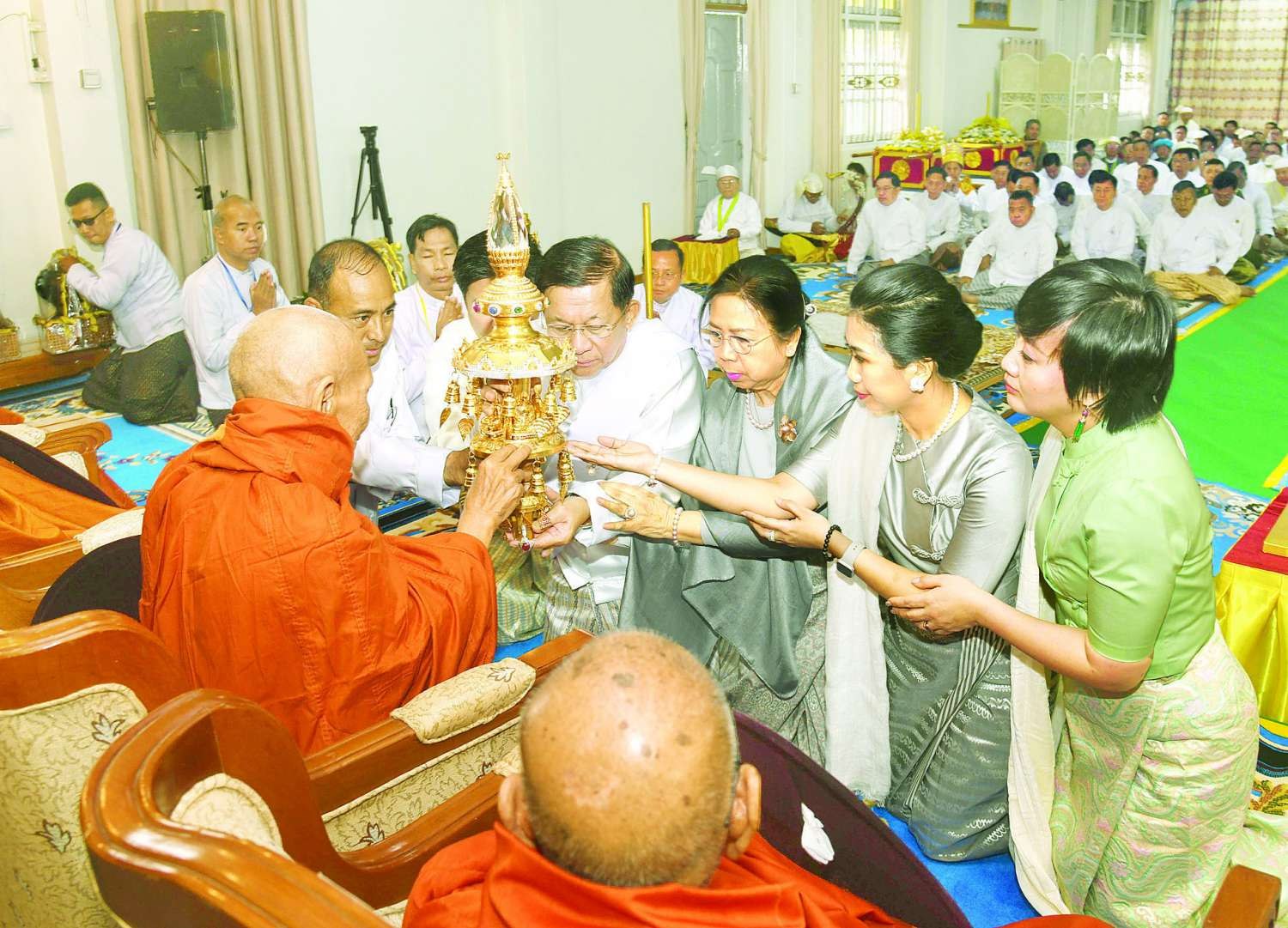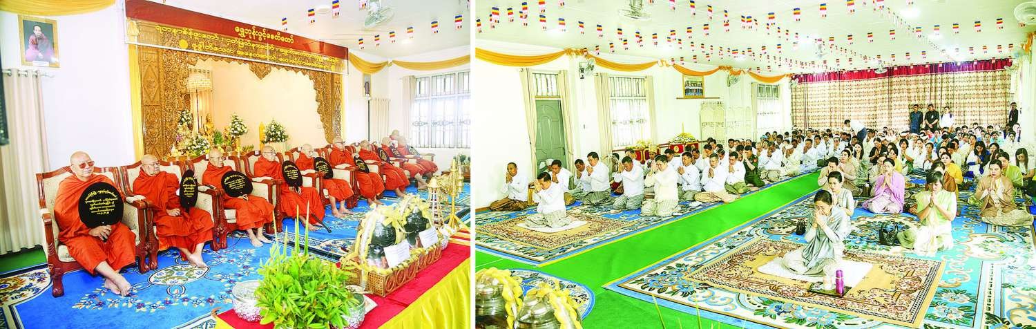 ဦးစွာ နိုင်ငံတော်စီမံအုပ်ချုပ်ရေးကောင်စီဥက္ကဋ္ဌ နိုင်ငံတော်ဝန်ကြီးချုပ်သည် ရွှေဘုန်းပွင့်စေတီတော်မြတ်ကြီး ဓမ္မာရုံတော်အတွင်းရှိ ဗုဒ္ဓရုပ်ပွားတော်မြတ်အား ဖူးမြော်ကြည်ညို၍ မြသပိတ်ဆွမ်းတော်၊ သစ်သီးပန်းမန်၊ သောက်တော်ရေချမ်းတို့ကို ဆက်ကပ်လှူဒါန်းသည်။