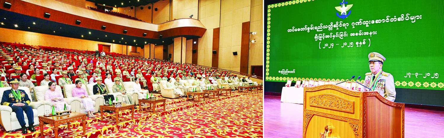 တပ်မတော်စွမ်းရည်သတ္တိဆိုင်ရာ ဂုဏ်ထူးဆောင်တံဆိပ်များ ချီးမြှင့်အပ်နှင်းခြင်း အခမ်းအနားကို ယနေ့မွန်းလွဲပိုင်းတွင် နေပြည်တော်ရှိ ဇေယျာသီရိဗိမာန်၌ ကျင်းပပြုလုပ်ရာ နိုင်ငံတော်စီမံအုပ်ချုပ်ရေးကောင်စီဥက္ကဋ္ဌ တပ်မတော်ကာကွယ်ရေးဦးစီးချုပ် ဗိုလ်ချုပ်မှူးကြီး သတိုးမဟာသရေစည်သူ သတိုးသီရိသုဓမ္မ မင်းအောင်လှိုင် တက်ရောက်မိန့်ခွန်းပြောကြားပြီး ဂုဏ်ထူးဆောင်တံဆိပ်များကို ချီးမြှင့်အပ်နှင်းပေးသည်။