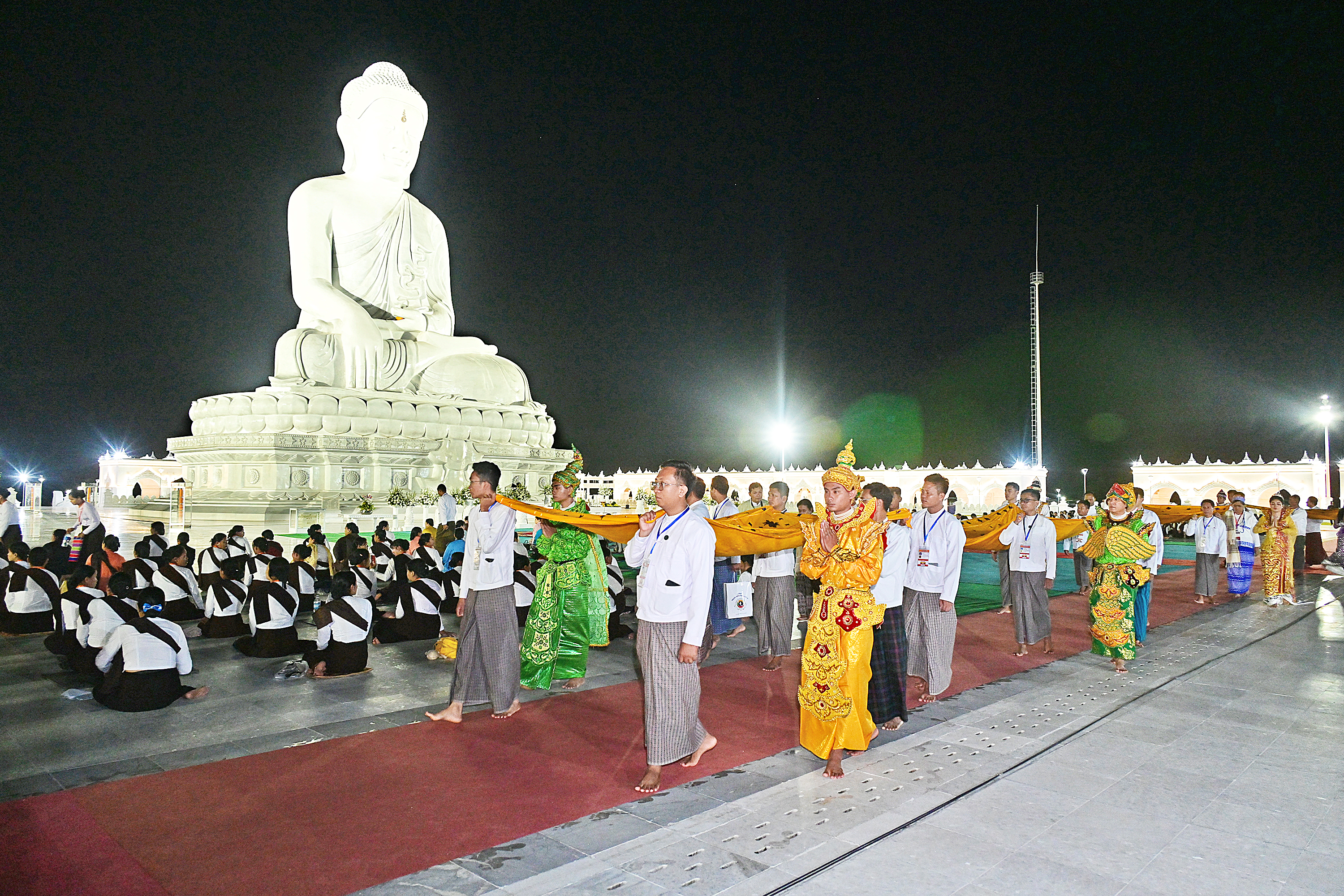 Acting President of the Republic of the Union of Myanmar and SSPC Chairman Senior General Min Aung Hlaing offers Matho golden lotus robes to Maravijaya Buddha Image