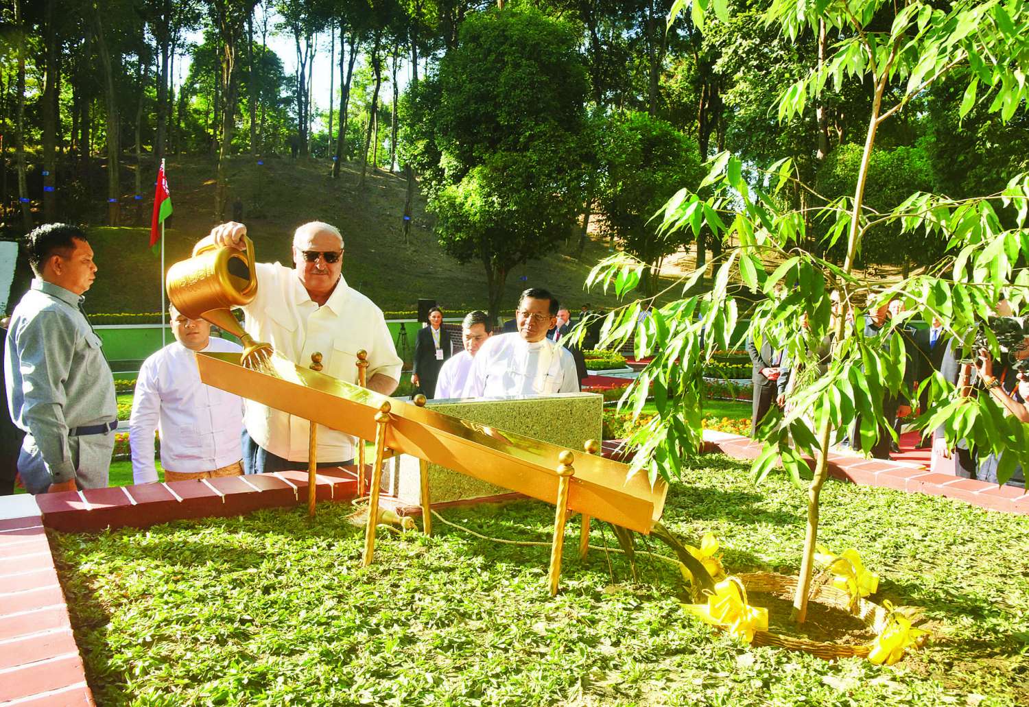 Belarus President Mr Aleksandr Lukashenko, Acting President of the Republic of the Union of Myanmar and SSPC Chairman Senior General Min Aung Hlaing plant commemorative tree