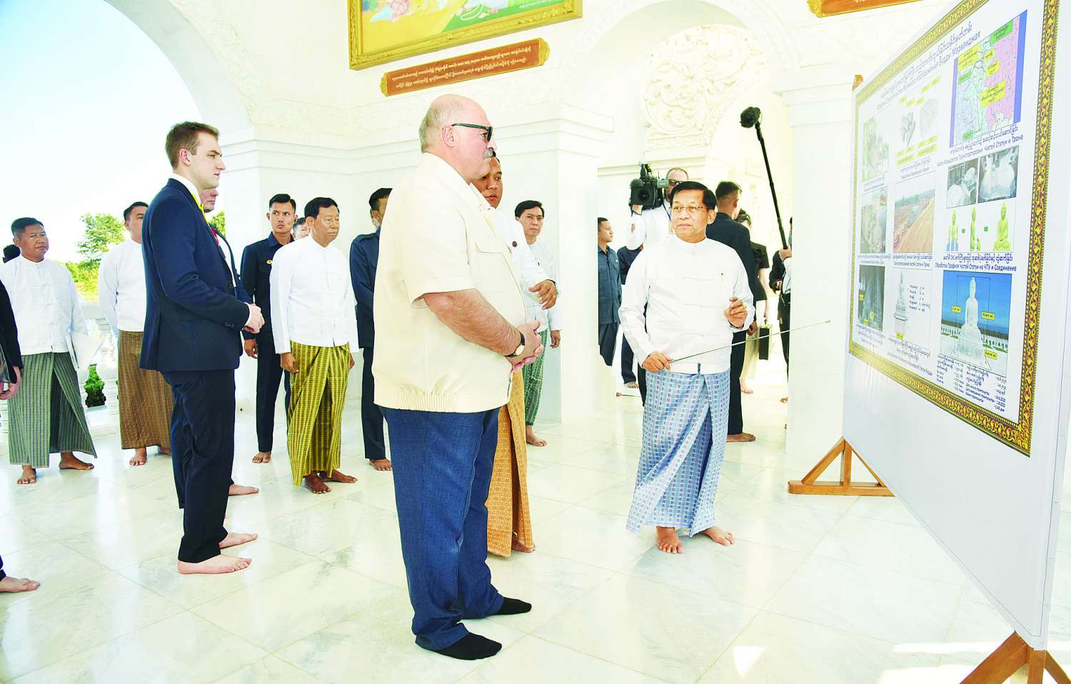 The Belarusian President and the Senior General were welcomed by SSPC member and Prime Minister U Nyo Saw, Commission Secretary and Joint Executive Chief General Ye Win Oo, Union Ministers U Mya Tun Oo, U Than Swe, U Maung Maung Ohn, U Tin Oo Lwin, U Ko Ko Lwin and U Myo Thant, the member of the Nay Pyi Taw Council, members of the image board of trustees and officials at the Buddha image.