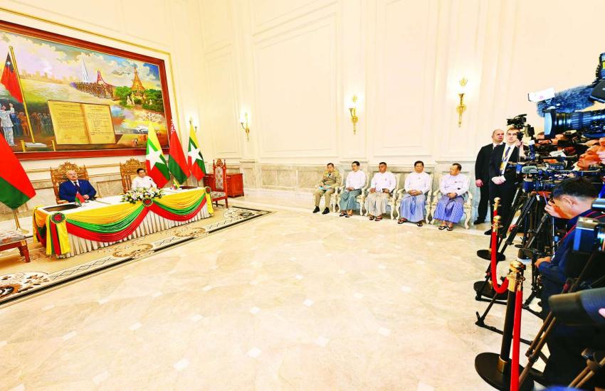 Myanmar Acting President & SSPC Chair Senior General Min Aung Hlaing and Belarus President Mr Aleksandr Lukashenko brief media on bilateral joint declaration