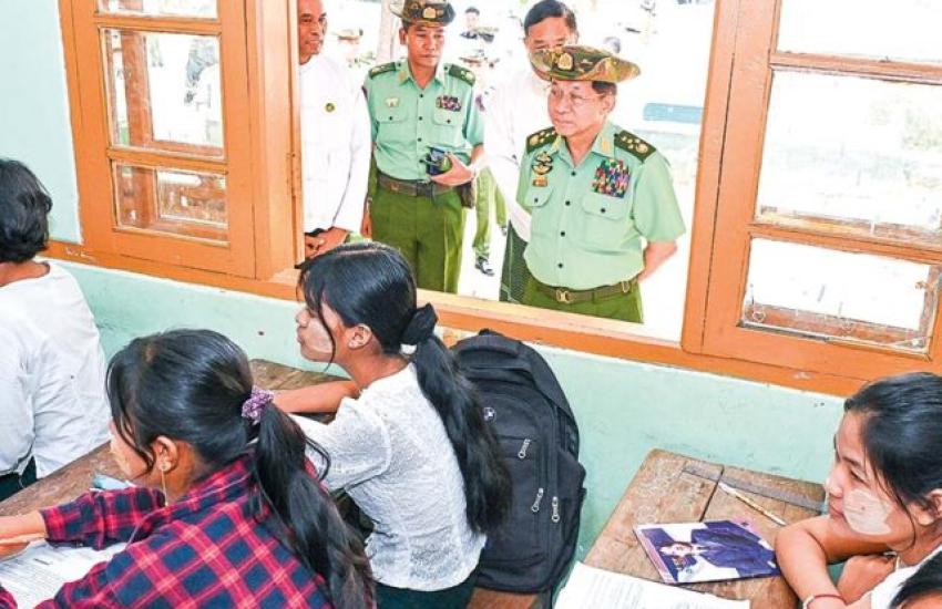SAC Chairman Commander-in-Chief of Defence Services Senior General Min Aung Hlaing, his wife Daw Kyu Kyu Hla inspect peaceful learning of students at Shande BEHS No 5