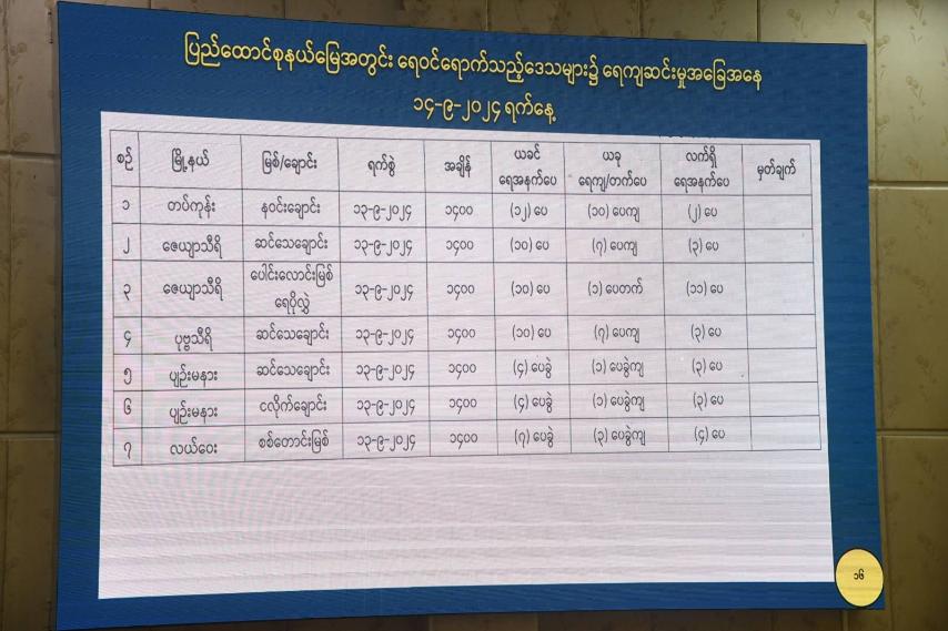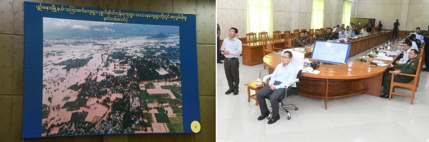 Nay Pyi Taw Council Chairman U Than Tun Oo and officials reported on flash floods in Tatkon, Pobbathiri, Zeyathiri, Pyinmana and Lewe townships starting from the morning of 11 September, overflow of Hsinthay Creek, conducting rescue and relief measures in difficulties in flooded water affected by Nawin, Mone and Kintha creeks, clearing of debris starting from 12 September, 42 deaths in incidents, floating of 33 houses, start of cleaning 3,819 flooded buildings, the progress of rescue, relief and rehabilitation, the opening of 82 relief camps to accommodate some 25,000 people.