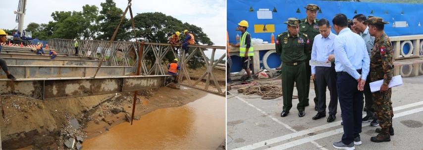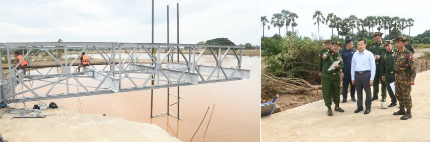 The Vice-Senior General inspected the construction of a bailey bridge and approach roads on both sides by the Directorate of Military Engineers of the Office of the Commander-in-Chief (Army) for Nawin Creek Bridge (Thayaaye) destroyed by erosion and left instructions on the long-term existence of the Bailey Bridge with resilience of natural disaster. The Bailey Bridge is scheduled to be finished in the last week of September.