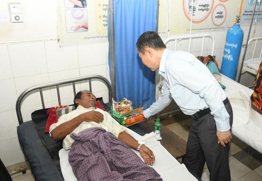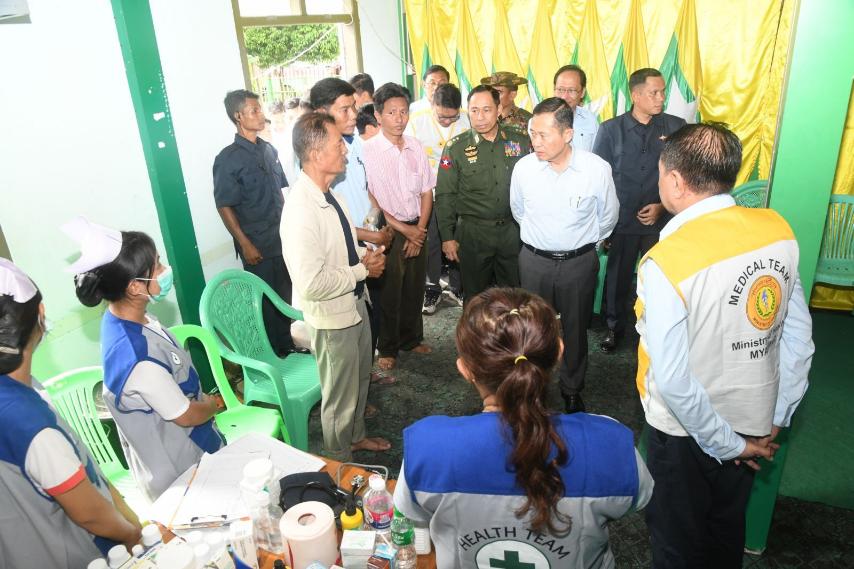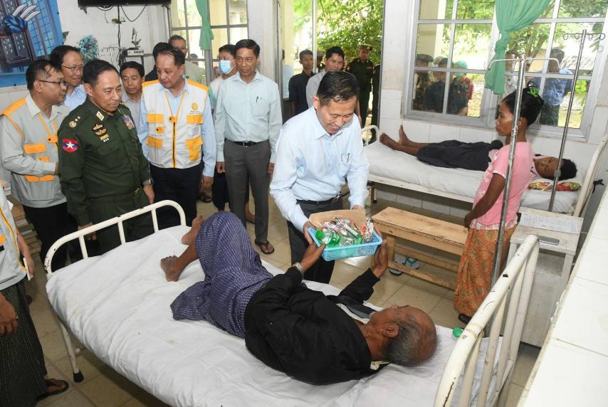 At flood-hit Tatkon Township Hospital (100-bed), the Vice-Senior General inspected repair works and comforted the patients.