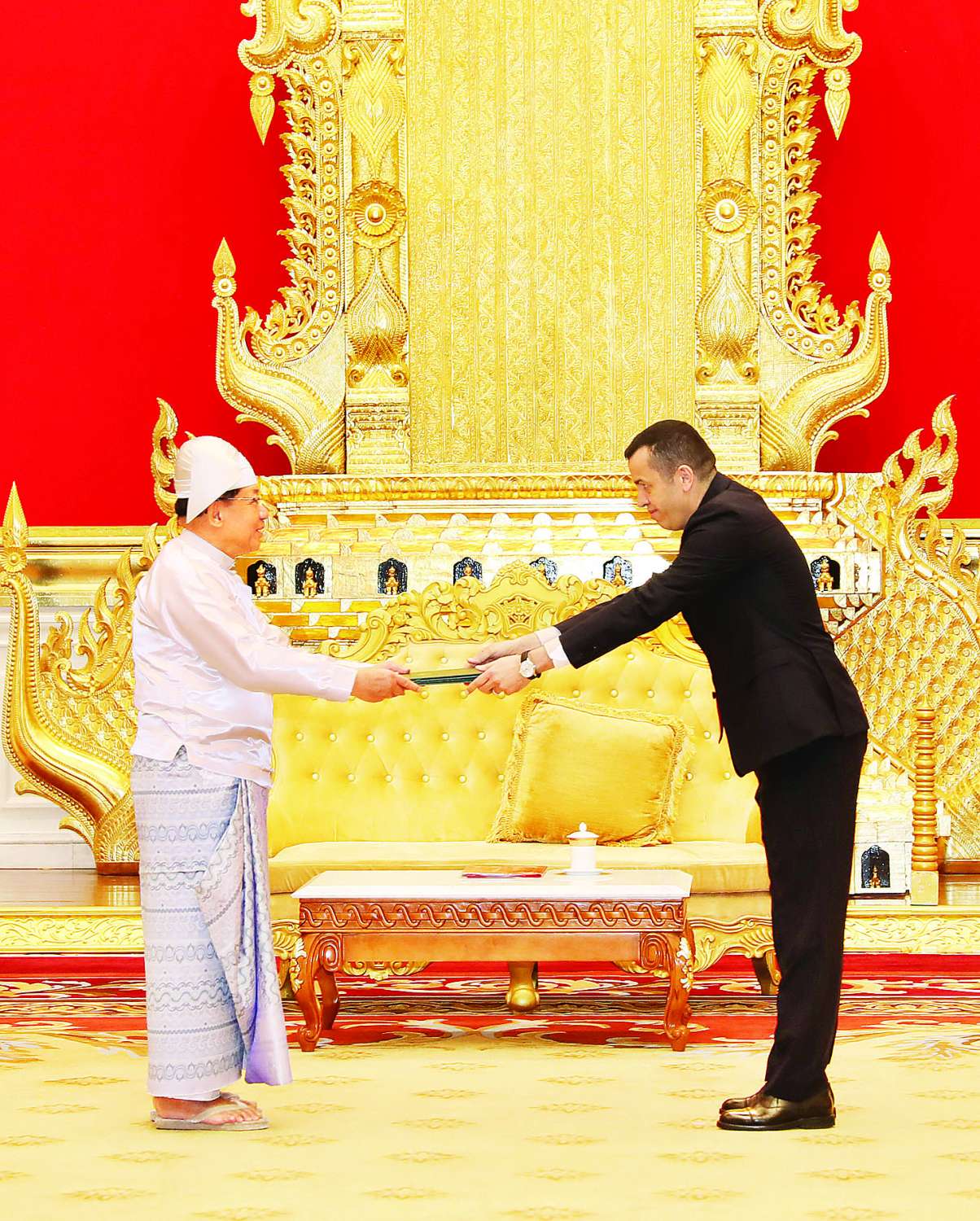 Acting President of the Republic of the Union of Myanmar and State Security and Peace Commission Chairman Senior General Min Aung Hlaing accepted the Credentials of Ambassador of the People’s Democratic Republic of Algeria to Myanmar Mr Azeddine Bechka at the Credentials Hall of the Office of the National Defence and Security Council in Nay Pyi Taw at 10 am yesterday.