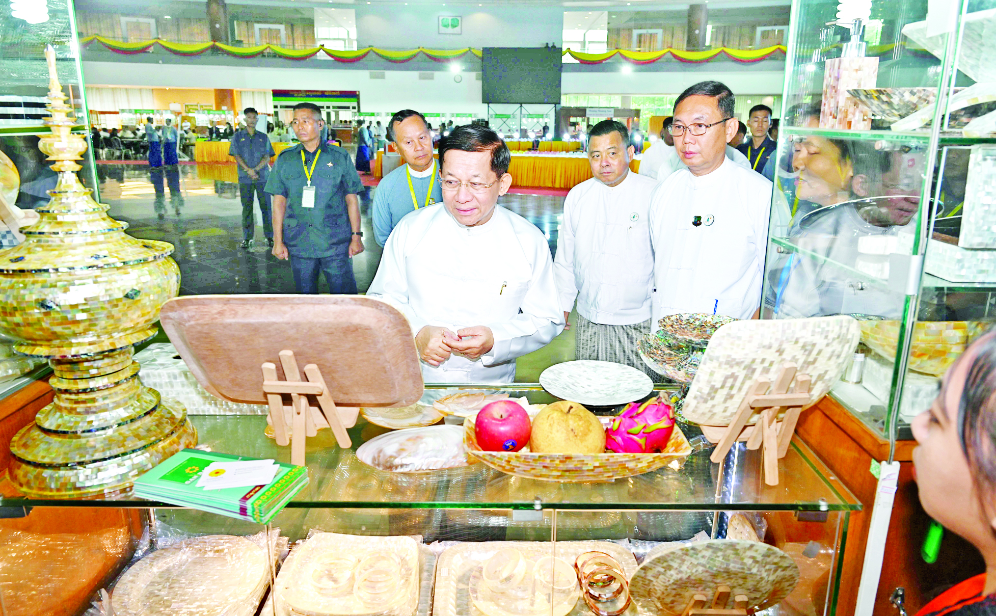 The Senior General and party viewed round display of pearl lots at Maniyadana Jade Hall for the 142nd Myanmar’s South Sea pearl emporium and private jewellery shops. Union Minister for Natural Resources and Environmental Conservation U Khin Maung Yi and officials conducted the Senior General and part round the jade hall.