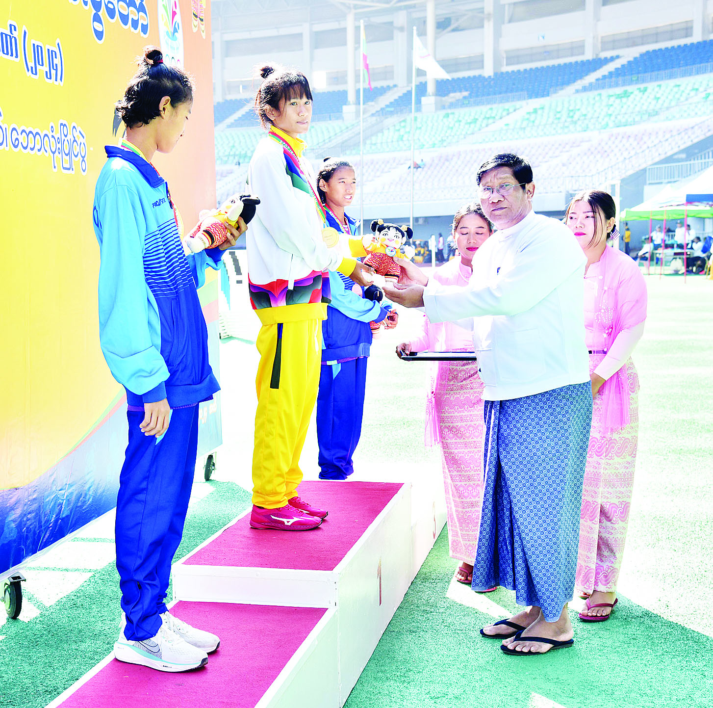 Myanmar Athletics Federation’s Secretary U Kyaw Htoo Aung awarded the first, second and third prize winners of the Ayeyawady Region team, Kachin State team and Shan State team in the men’s triple jump event, and another first, second and third prize winners of the Shan State team, the Bago Region team and the Taninthayi Region team in women’s 400-metre race.