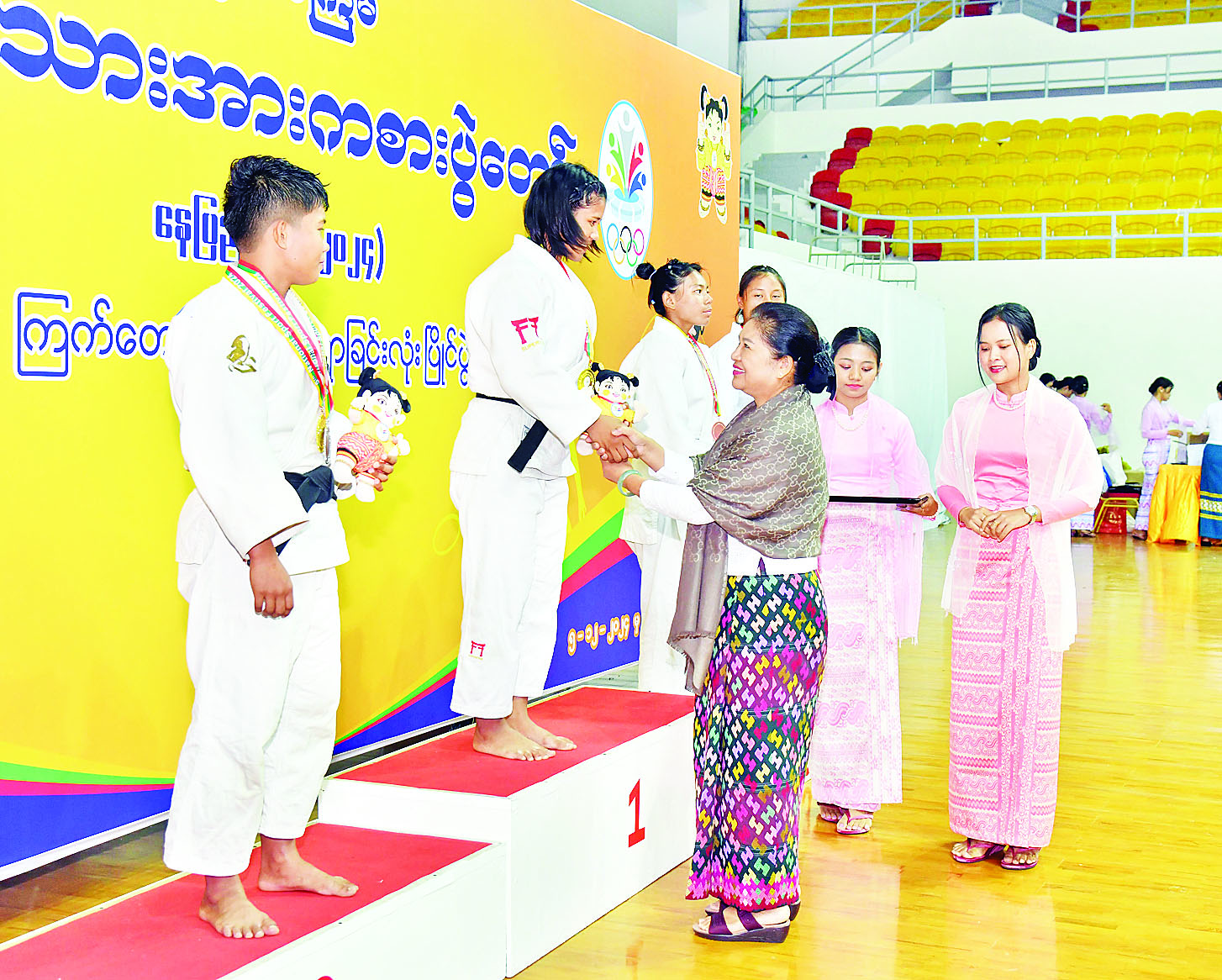 Union Minister and Union Attorney-General Dr Thida Oo presented the first prize to the Kachin State team, the second to the Sagaing Region team and the third to Bago Region and Mandalay Region teams in women’s 45-kilogramme judo event, SAC member U Yan Kyaw, the first prize to the Kachin State team, the second to the Ayeyawady Region team and the third to Mandalay Region and Yangon Region teams in the women’s 48-kilogramme judo event.