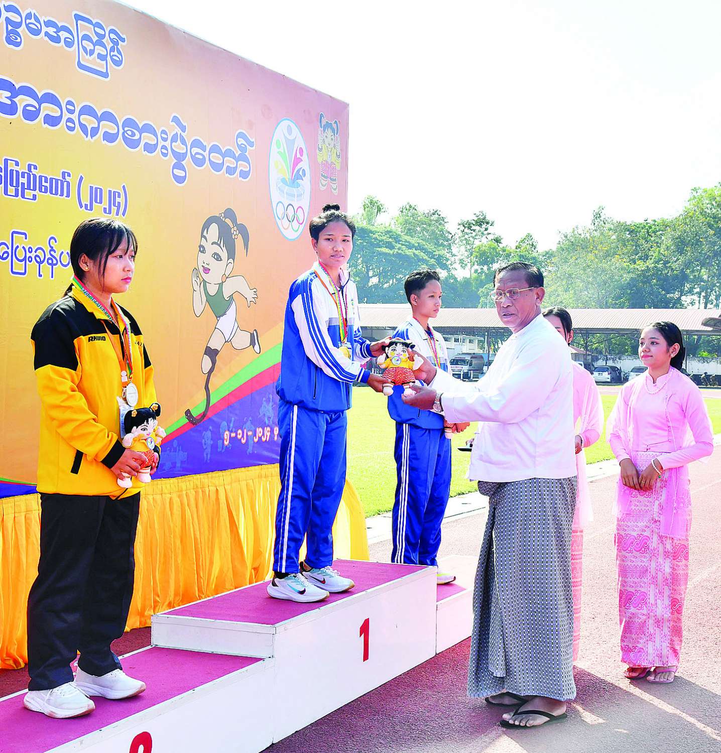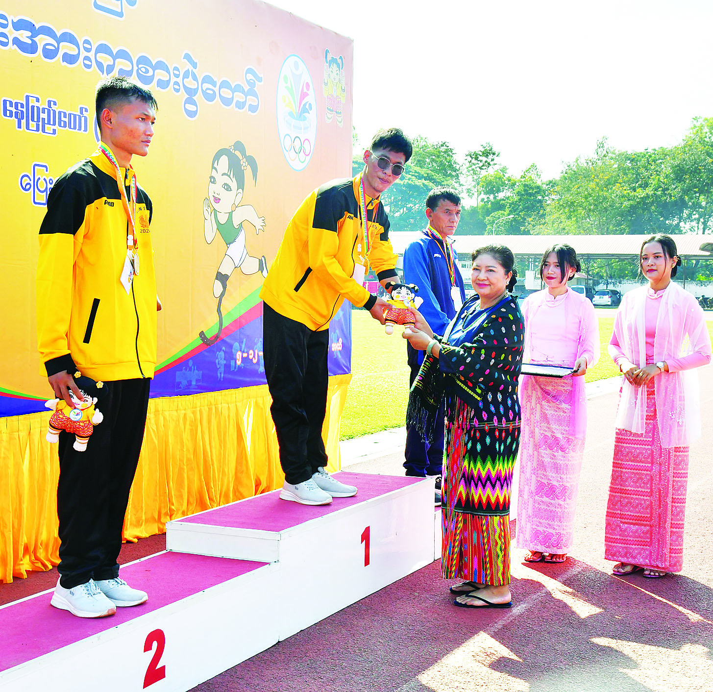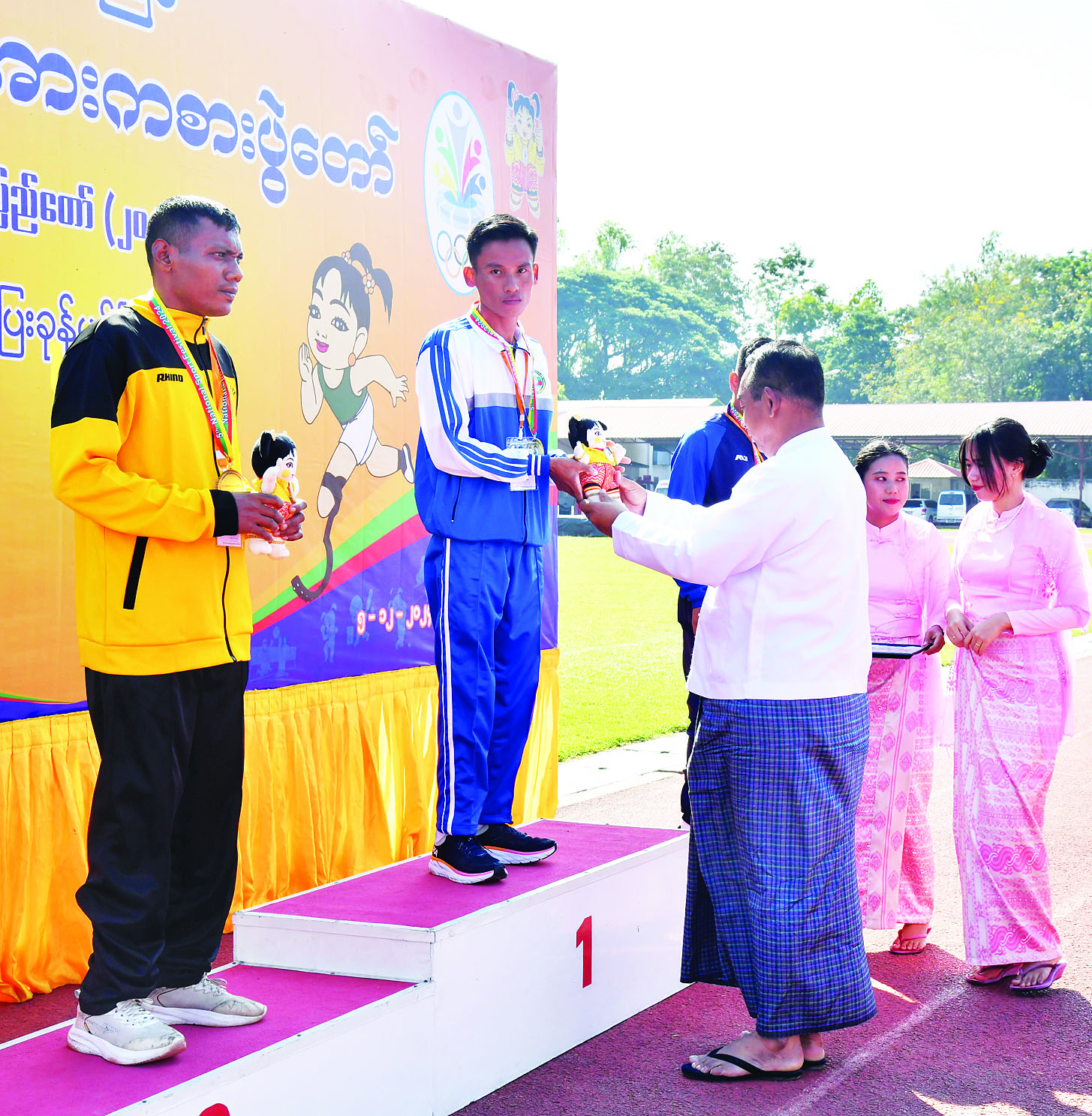 Union Minister U Min Thein Zan awarded first, second and third prizes to Bago Region, Mandalay Region and Mon State teams in the men’s discus F62/63 event; the first prize to Yangon Region and second and third prizes to Mandalay Region in the women’s shot put F54/55 event, and Union Minister U Myint Naung gave first, second and third prizes to Ayeyawady Region, Mon State and Mandalay Region teams in the men’s 400-metre T 64 race, respectively.