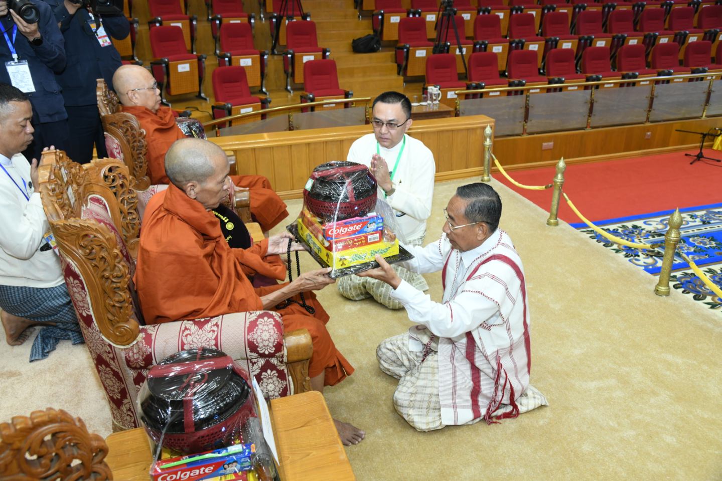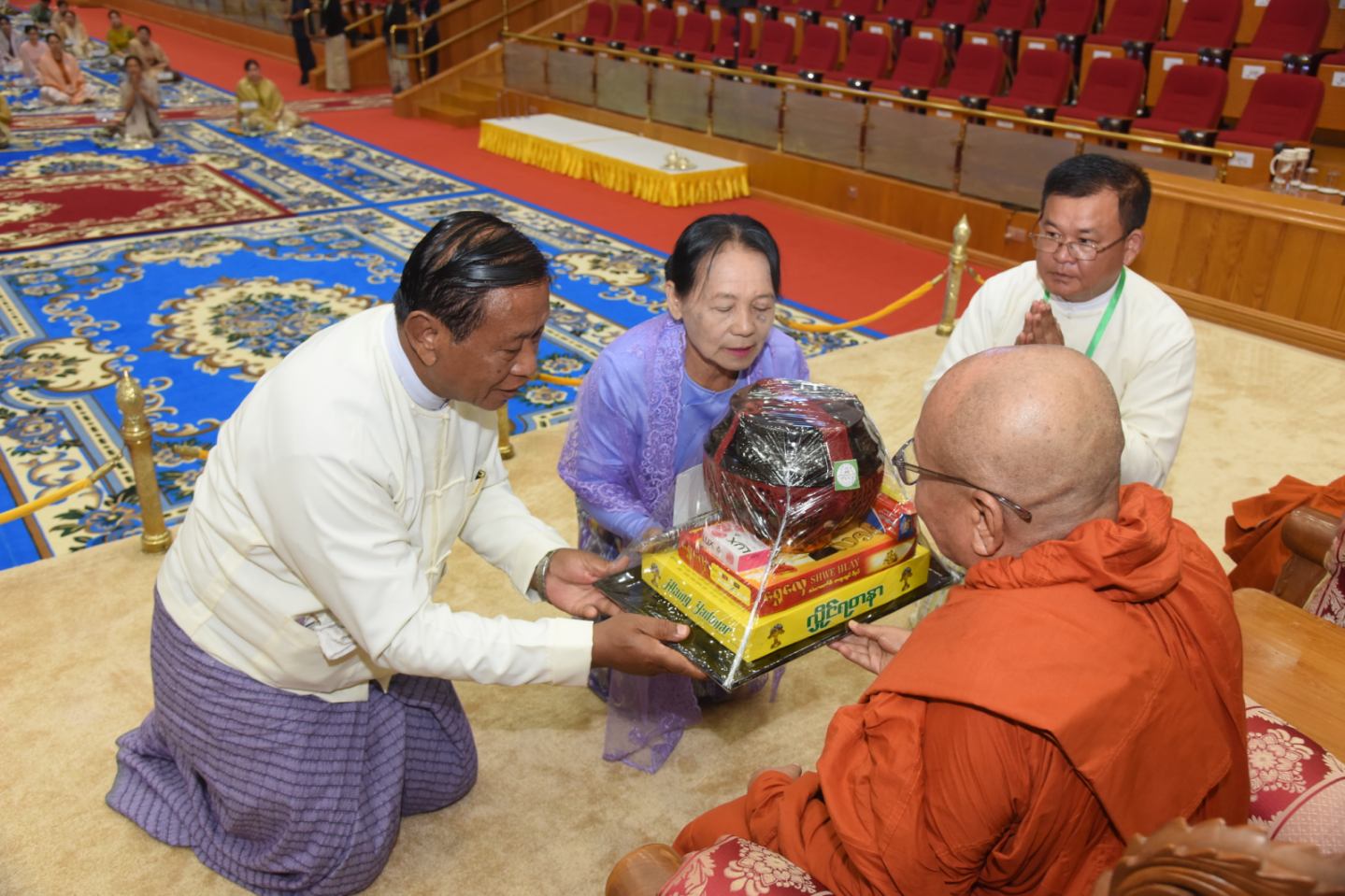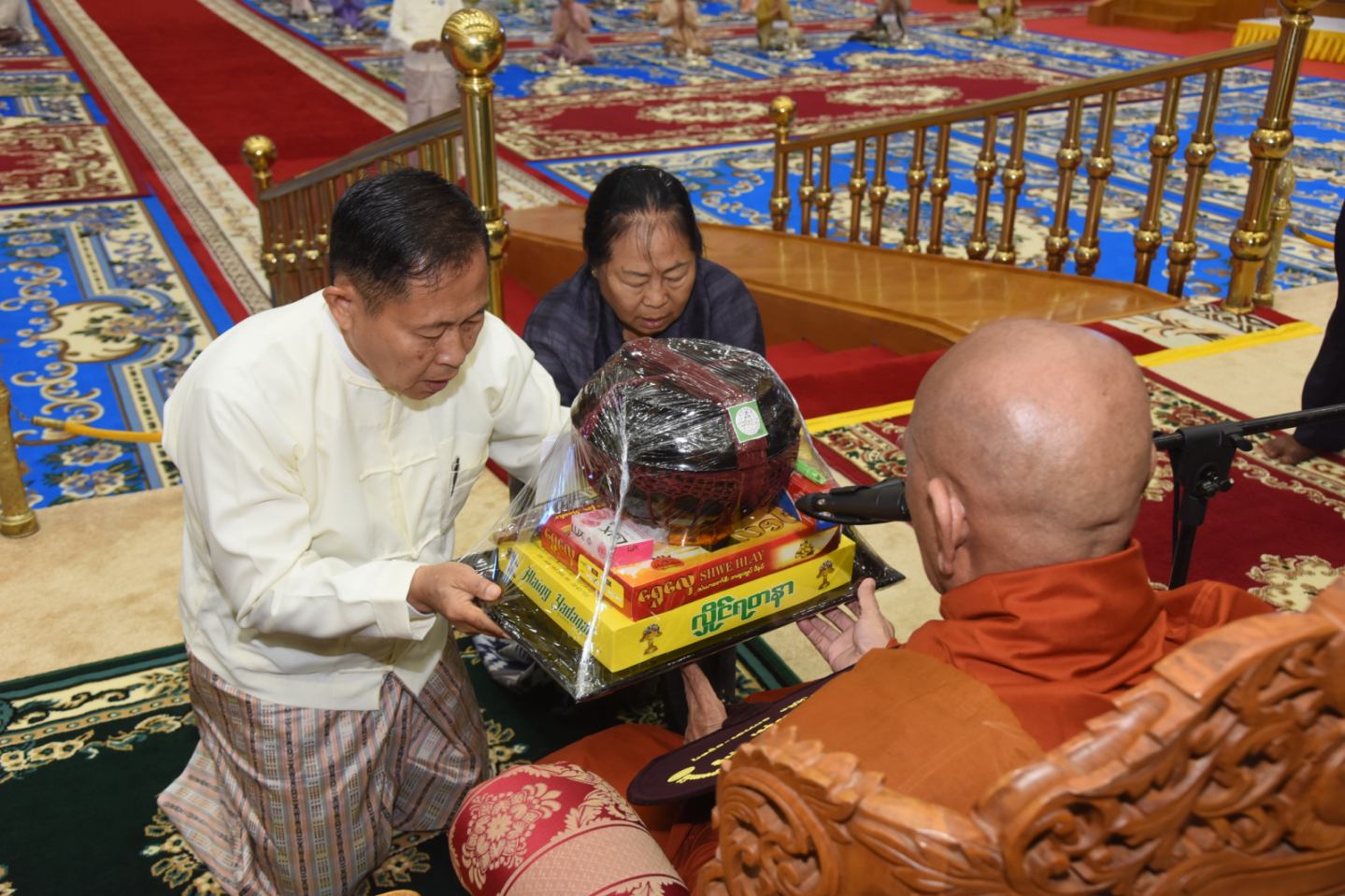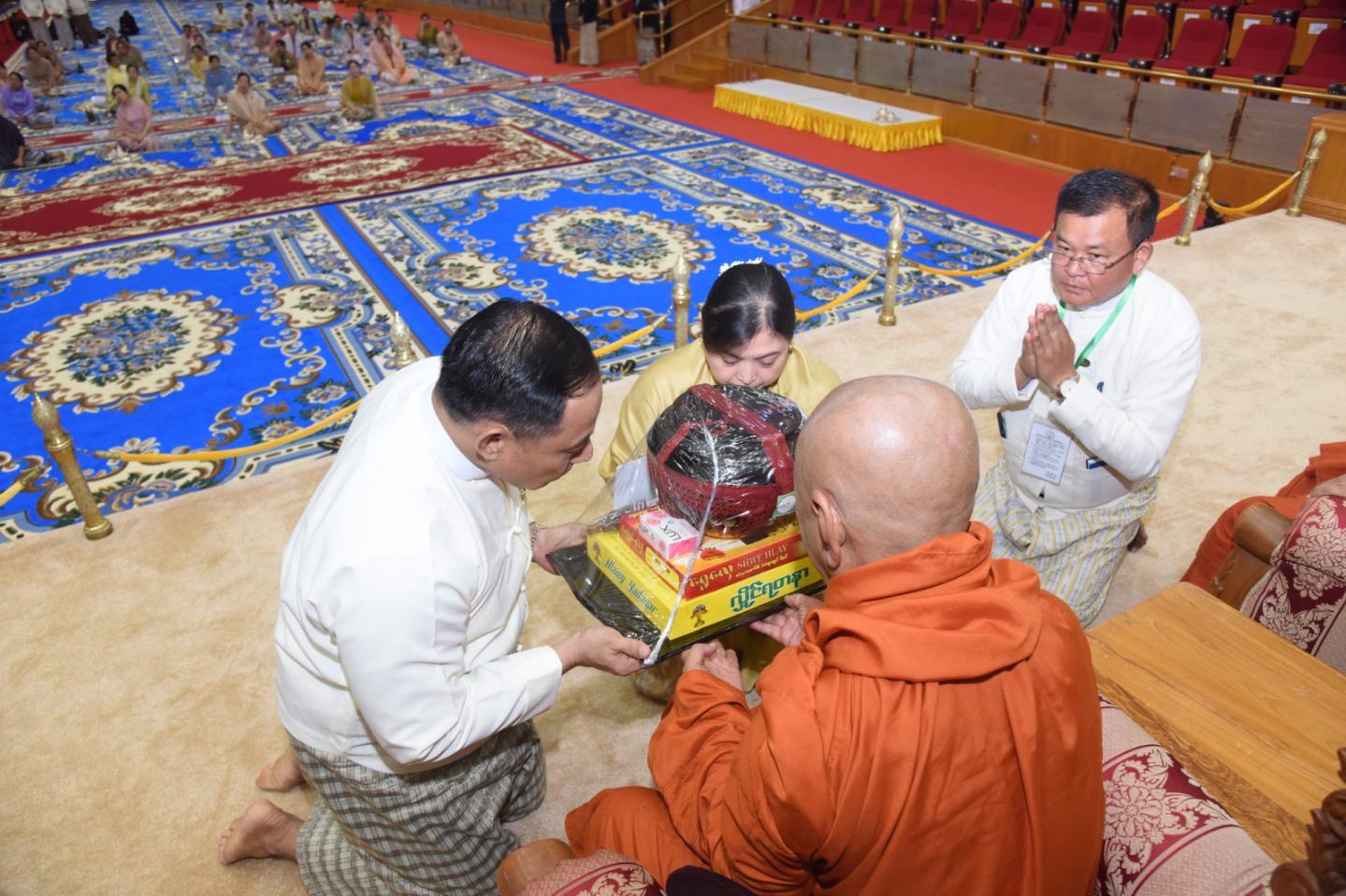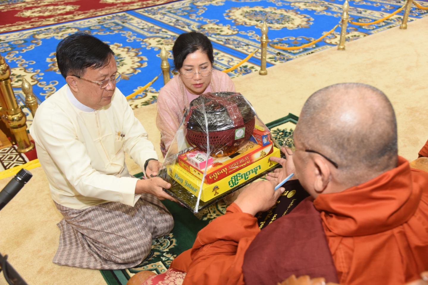 The ceremony was attended by Chairman of the State Sangha Maha Nayaka Committee Presiding Patron of Thanlyin’s Minkyaung Pahtamabyan Buddhism Learning Centre Aggamaha Pandita Aggamaha Saddhammajotikadhaja Dr Bhaddanta Candima Bhivamsa, Secretary of SSMNC Presiding Patron of New Masoeyein Monastery of Mahaaungmyay Township of Mandalay Abbot of Dhammathameikdi Monastery Aggamaha Pandita Aggamaha Saddhammajotikadhaja Maha Dhammakathika Bahujanahitadhara Bhaddanta Vasettha Bhivamsa and members of the Sangha, the Council Secretary and his wife, council members and their wives, Union-level dignitaries, Union ministers and their wives, the Nay Pyi Taw Council Chairman, senior Tatmadaw officers from the Office of the Commander-in-Chief and their wives, the commander of Nay Pyi Taw Command and officials.