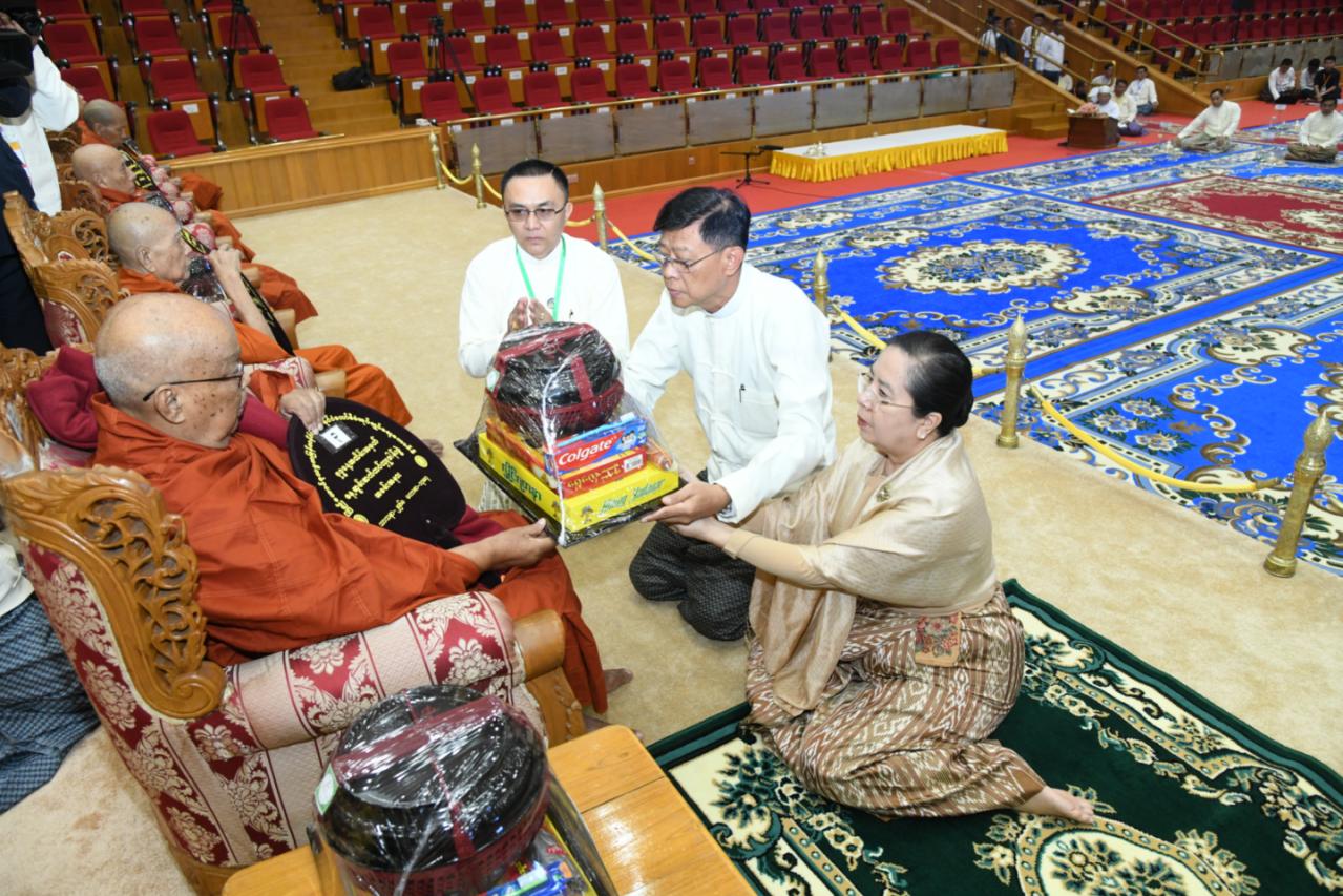 SAC Vice-Chairman DPM Vice-Senior General Soe Win, wife Daw Than Than Nwe offer alms and day meals to venerable members of the Sangha at Buddha Day ceremony