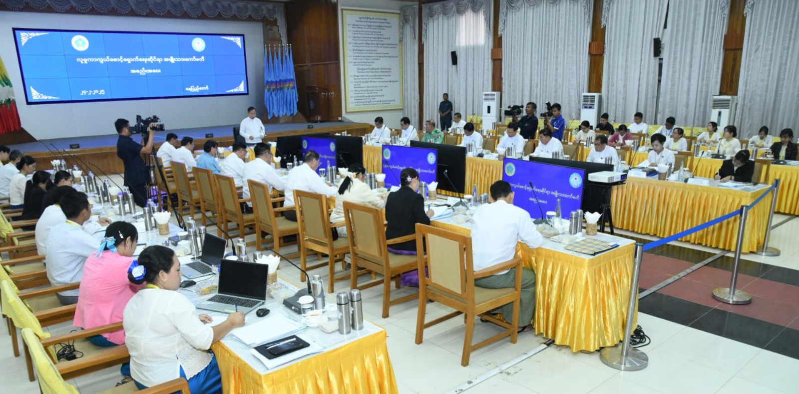 Then, Committee Vice-Chairpersons Union Ministers Dr Soe Win, U Chit Swe, and Dr Thet Khaing Win reported on the current undertaking of social protection work plans, full benefits for employees, and healthcare services.