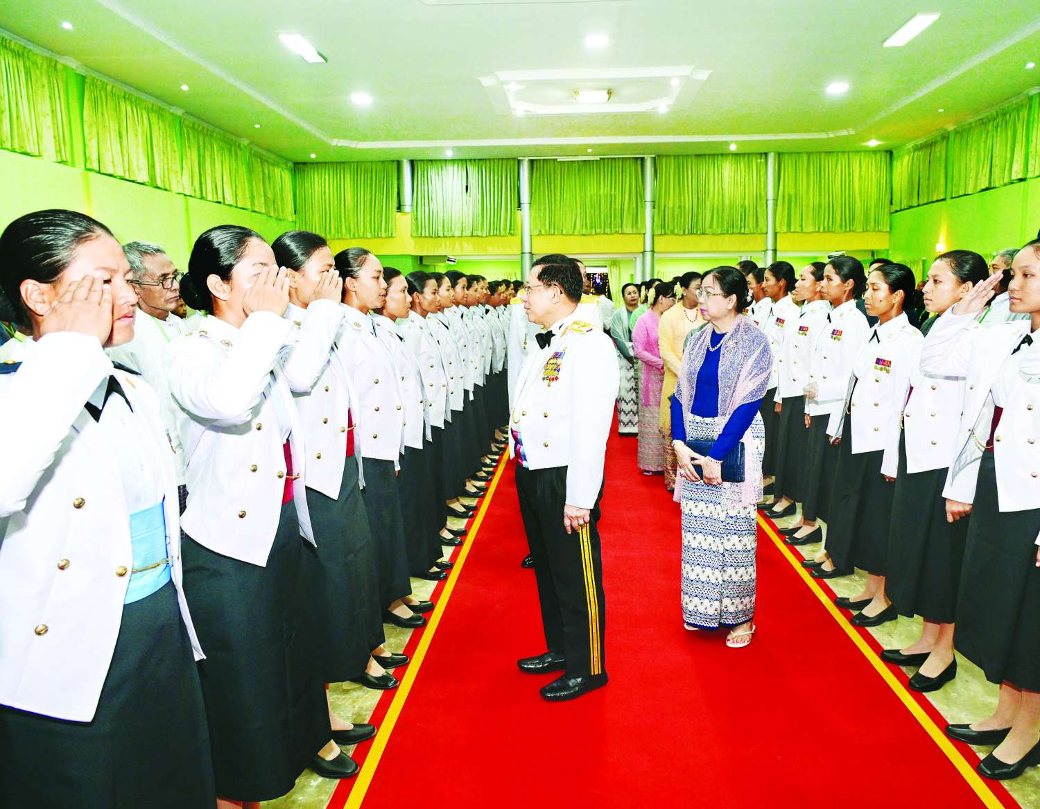 Also, present at the dinner were his wife Daw Kyu Kyu Hla, Commander-in-Chief (Navy) Admiral Htein Win and his wife, Commander-in-Chief (Air) General Tun Aung and his wife, senior Tatmadaw officers from the Office of the Commander-in-Chief and their wives, Union-level dgnitaries and Union ministers and their wives, the commander of Yangon Command, the commandant of OTS (Hmawby), officials of Hmawby Station, and parents and relatives of the female graduate officers.