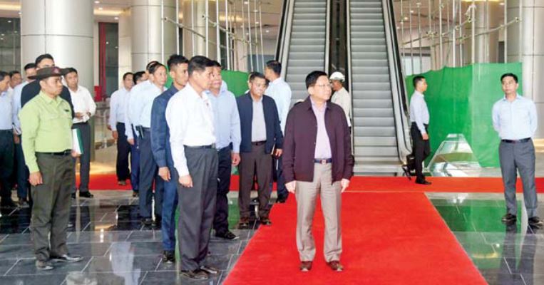 On arrival at the construction project of the Thumingala Market (Nyan-taw Market) in PyinOoLwin, the Senior General heard reports on progress of the market project, completion of the Curved LED Display which is the largest in Myanmar, and finishing of the front wing of the market, installation of the chandeliers, construction of the car parks, supply of electricity for six hours to the whole project through solar system, except the air-conditioner system, water supply and sewage facility, and supervision for completion of the project on schedule in the construction standards.