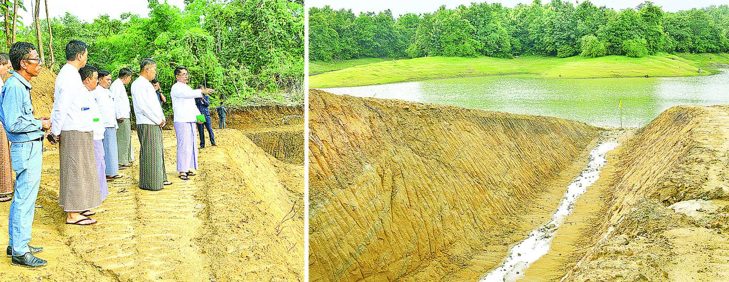 Concerning repairing the dam, efforts are being made to build a reserved spillway channel, dig a 1,350 feet route of the water inlet channel heading to Chaungmagyi Dam, place concrete on the low-laying area of the main spillway, remove water and silt between the temporary dyke and the original embankment, and construct a ring bund to protect the tower against the inflow of water. Moreover, the concrete tower was demolished to carry out cleansing tasks, including removing the valves of the sluice gate, permanently closing the conduit damaged by the earthquake, filling soil on the eastern part of the embankment with banquette to ensure long-term strengthening, and removing the soil from the landslide areas downstream of the dam. In addition, the embankment was refilled with soil in its original state with the construction of a concrete valve with 6 feet by 8 feet in size at the diversion channel. The conduit was drilled to have a hole to fill with concrete into the concrete pipe, while a socket is being made to be installed to block the concrete pipe, and the design is being formulated swiftly to install the valve in the diversion channel.