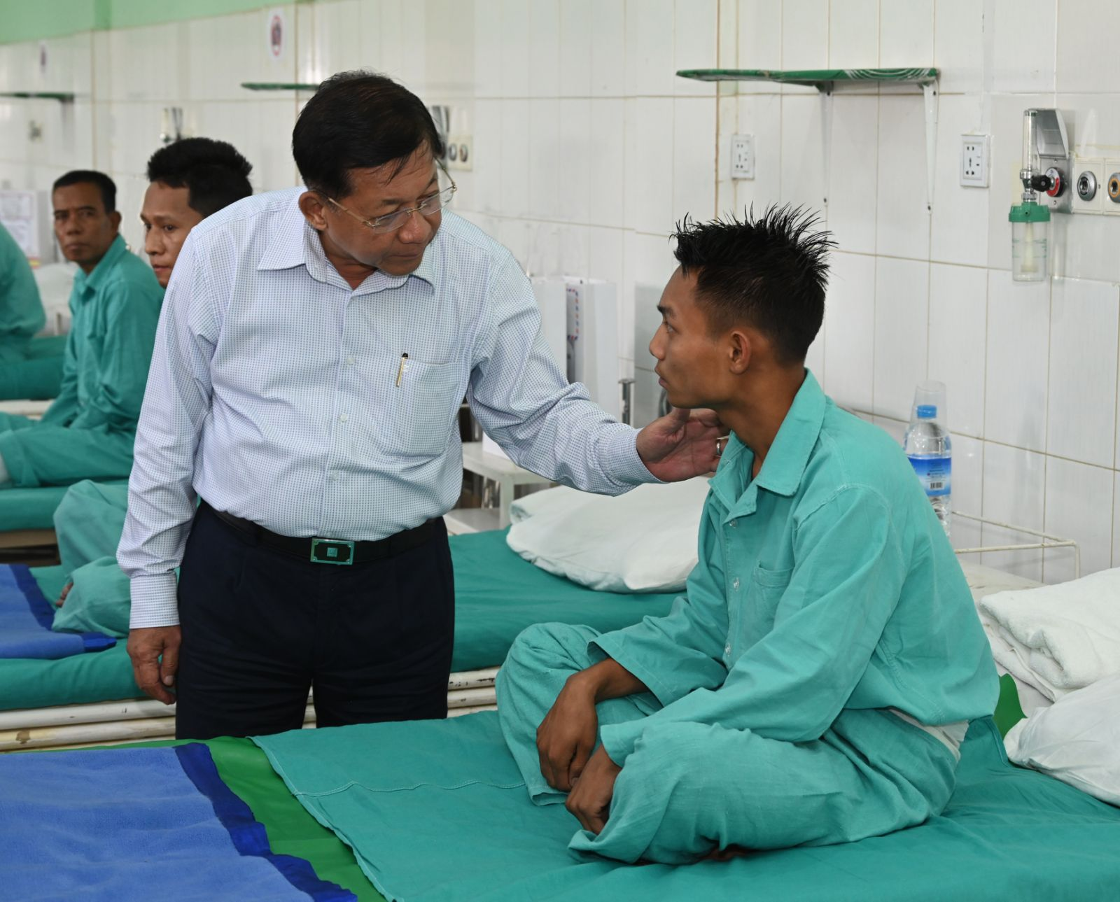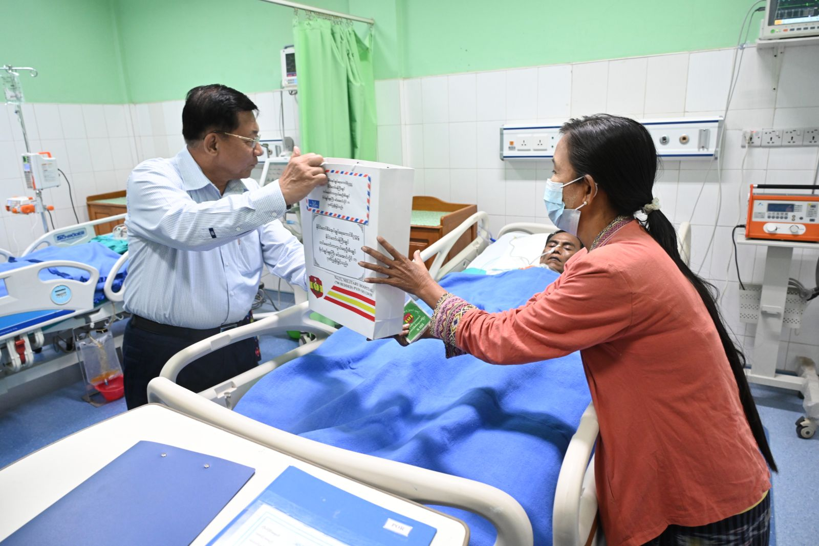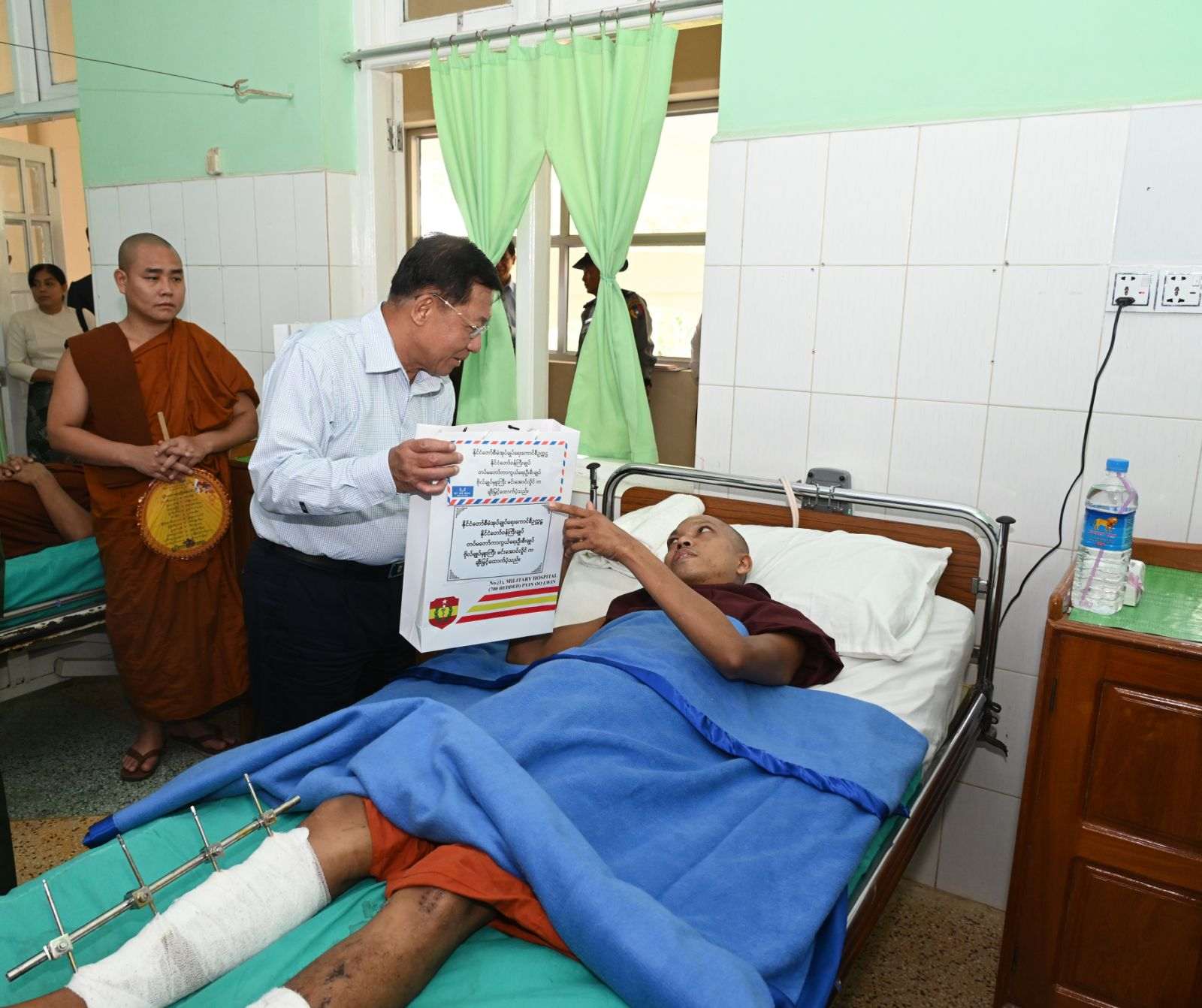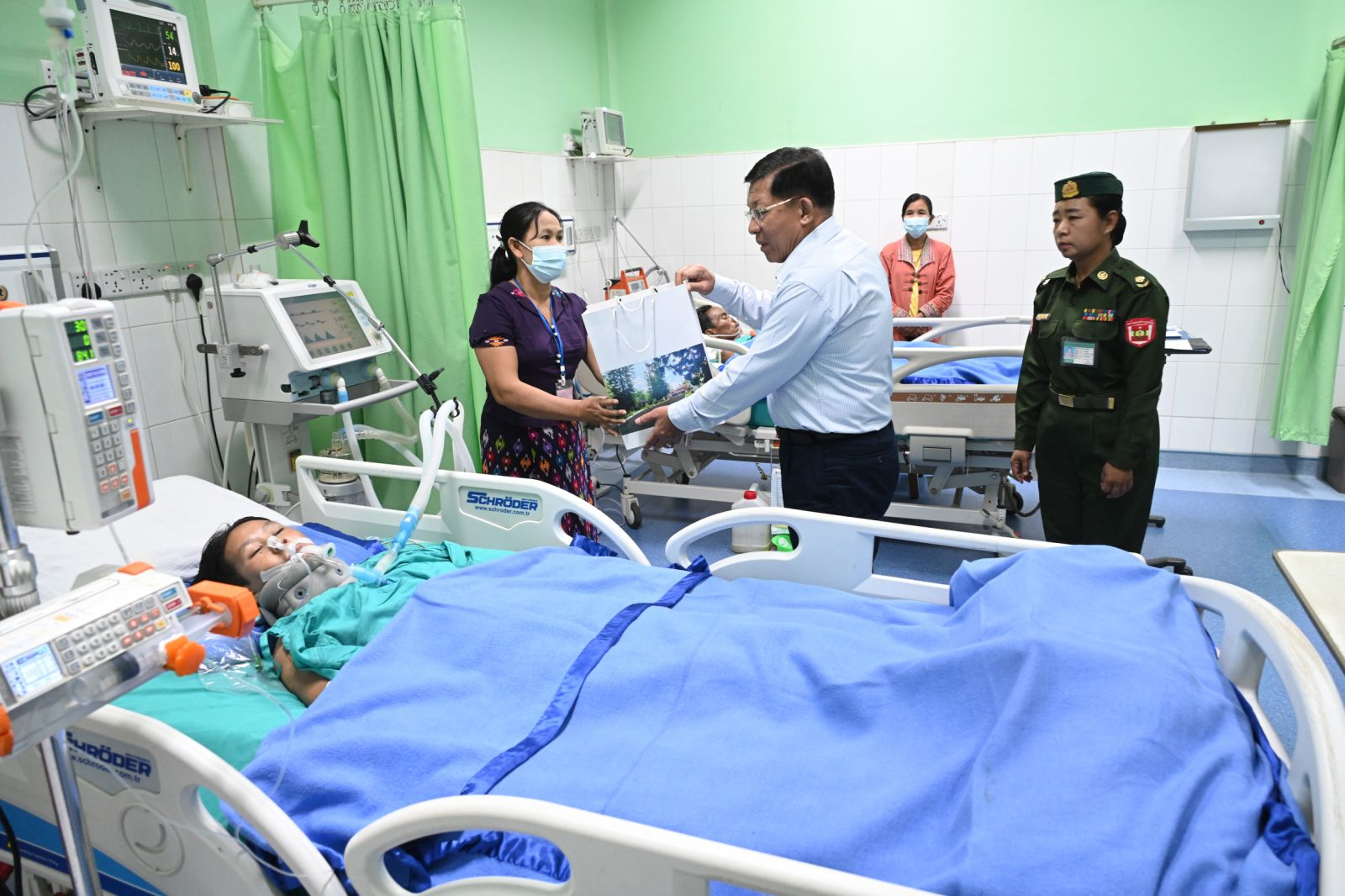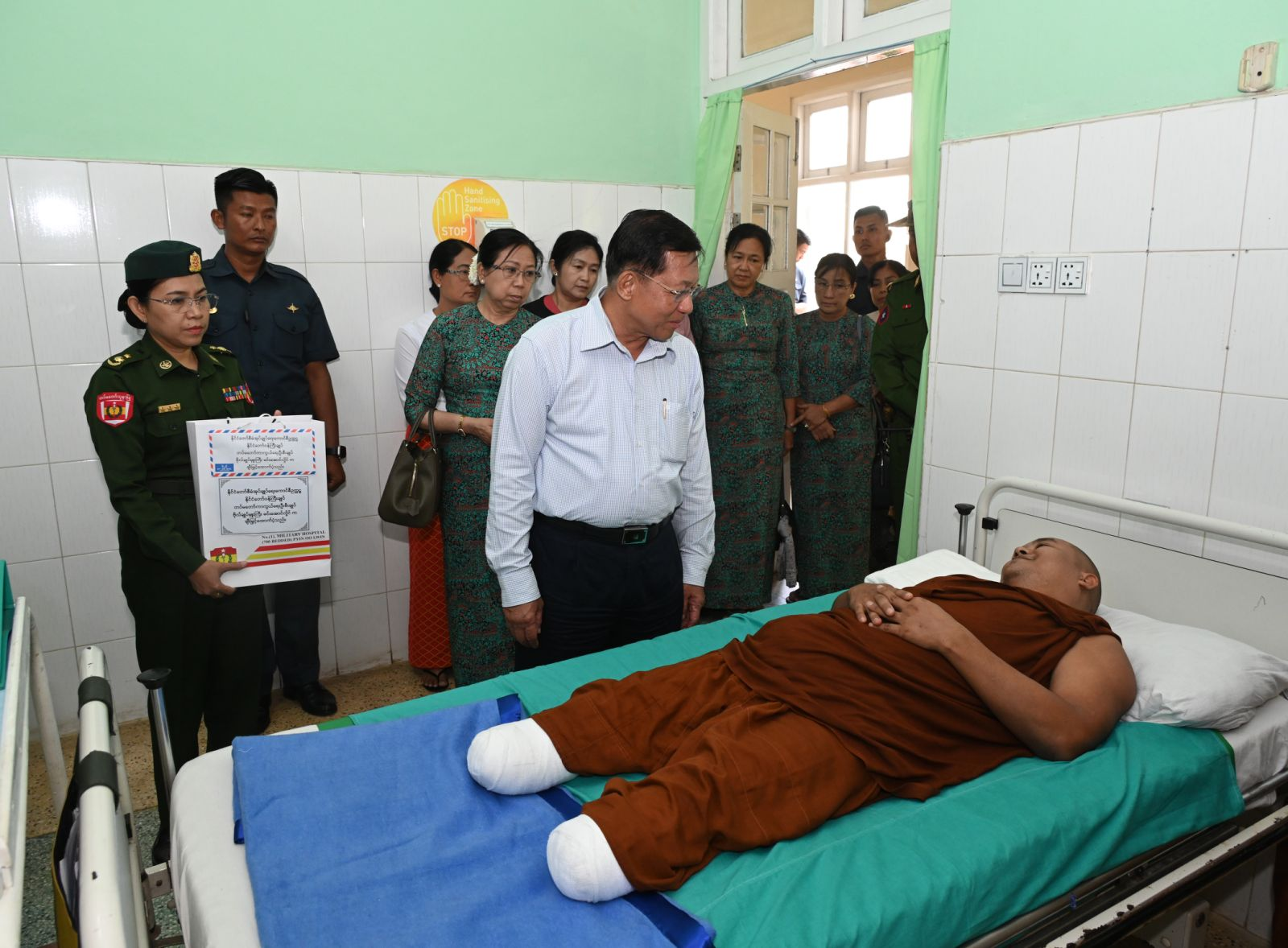 SAC Chairman Prime Minister Senior General Min Aung Hlaing, wife Daw Kyu Kyu Hla look into health conditions of earthquake-affected Tatmadaw members, families and police members at Tatmadaw hospital in PyinOoLwin