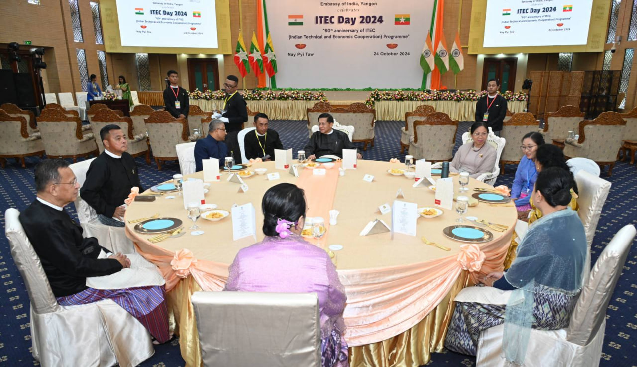 ယင်းနောက် နိုင်ငံတော်စီမံအုပ်ချုပ်ရေးကောင်စီဥက္ကဋ္ဌ နိုင်ငံတော်ဝန်ကြီးချုပ်နှင့် ဇနီး၊ အခမ်းအနားတက်ရောက်လာကြသူများသည် ၂၀၂၄ ခုနှစ်၊ အိန္ဒိယနည်းပညာနှင့် စီးပွားရေးပူးပေါင်းဆောင်ရွက်မှုအစီအစဉ်၏ နှစ်(၆၀)ပြည့် အထိမ်းအမှတ် ဂုဏ်ပြု ညစာကို အတူတကွ သုံးဆောင်ခဲ့ကြကြောင်း သတင်းရရှိသည်။
