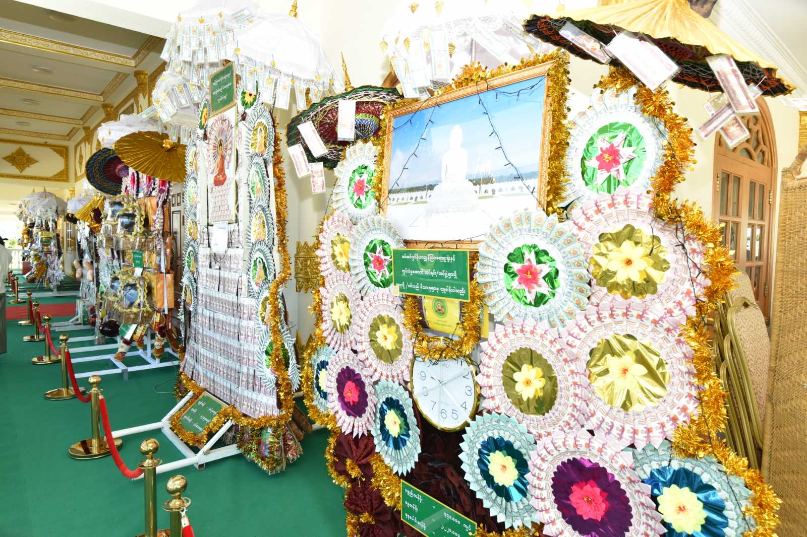 ထို့နောက် နိုင်ငံတော်စီမံအုပ်ချုပ်ရေးကောင်စီဥက္ကဋ္ဌ နိုင်ငံတော်ဝန်ကြီးချုပ်နှင့် အခမ်းအနား တက်ရောက်လာသည့် ဧည့်ပရိသတ်များသည် ကထိန်ခံမာရဝိဇယကျောင်းတော်ကြီးသို့ လှူဒါန်းရန်ခင်းကျင်းပြင်ဆင်ထားသည့် ကထိန်လျာသင်္ကန်း၊ လှူဖွယ်ပစ္စည်းများနှင့် ပဒေသာပင်များအား လှည့်လည်ကြည့်ရှုကြသည်။