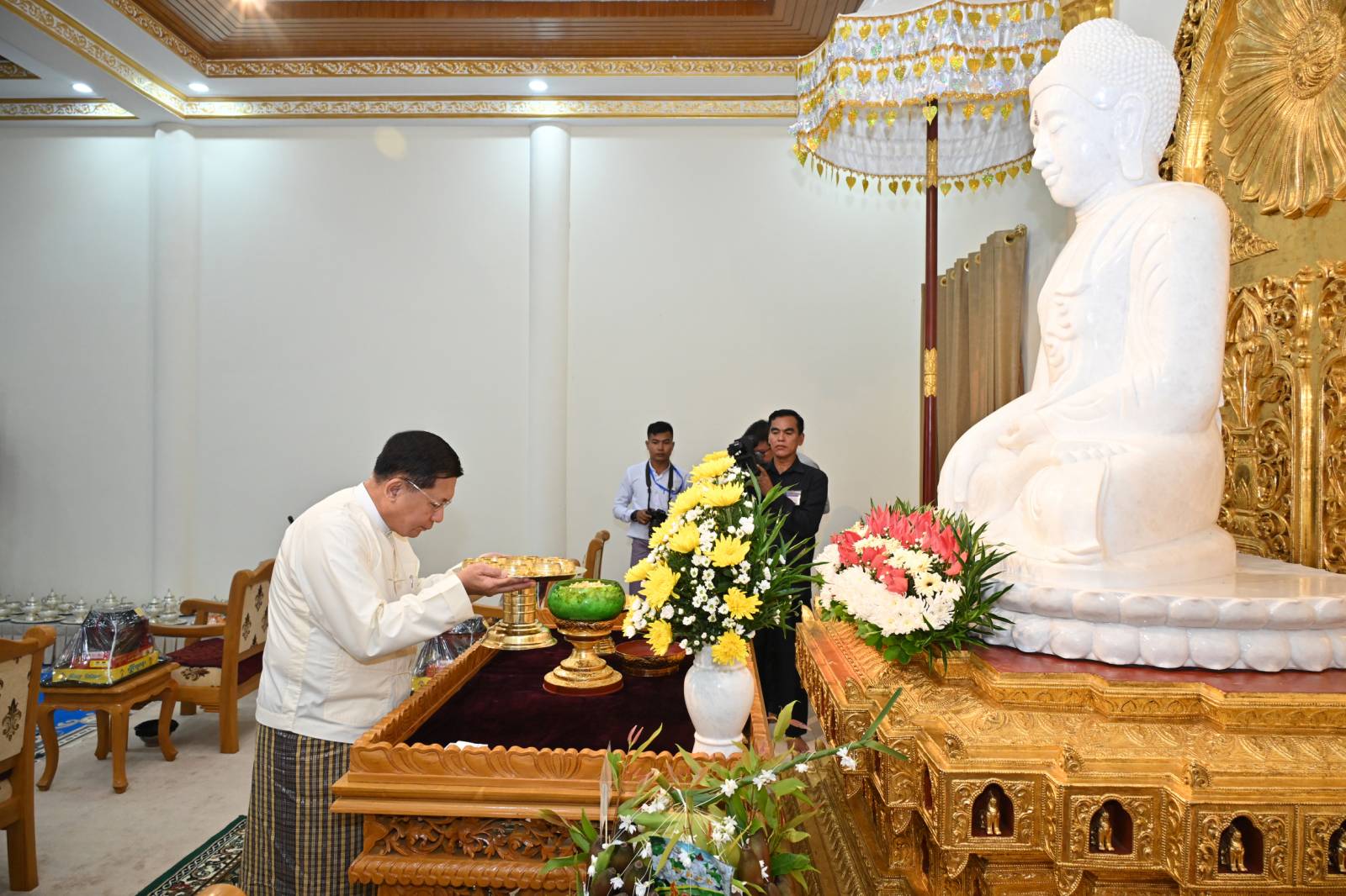 ဦးစွာ နိုင်ငံတော်စီမံအုပ်ချုပ်ရေးကောင်စီဥက္ကဋ္ဌ နိုင်ငံတော်ဝန်ကြီးချုပ်က မာရဝိဇယကျောင်းဆောင်တော်အတွင်းရှိ ဗုဒ္ဓရုပ်ပွားတော်မြတ်အား မြသပိတ်ဆွမ်းတော်၊ သစ်သီးနှင့်ပန်းမန်၊ သောက်တော်ရေချမ်းများ ကပ်လှူပူဇော်သည်။